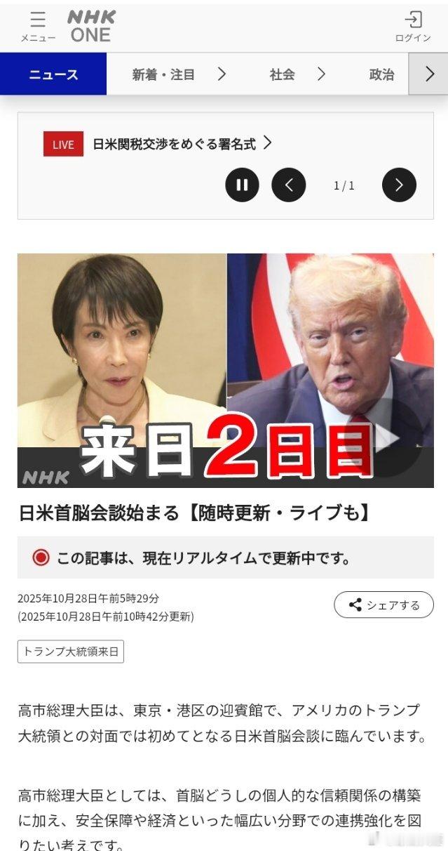 高市总理大臣在东京港区的迎宾馆与美国总统特朗普进行首次面对面的日美首脑会谈。(日本NHK报道)