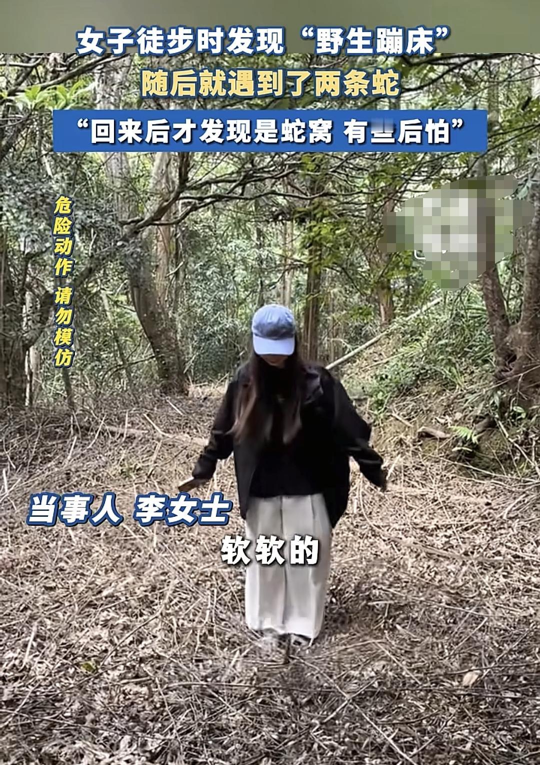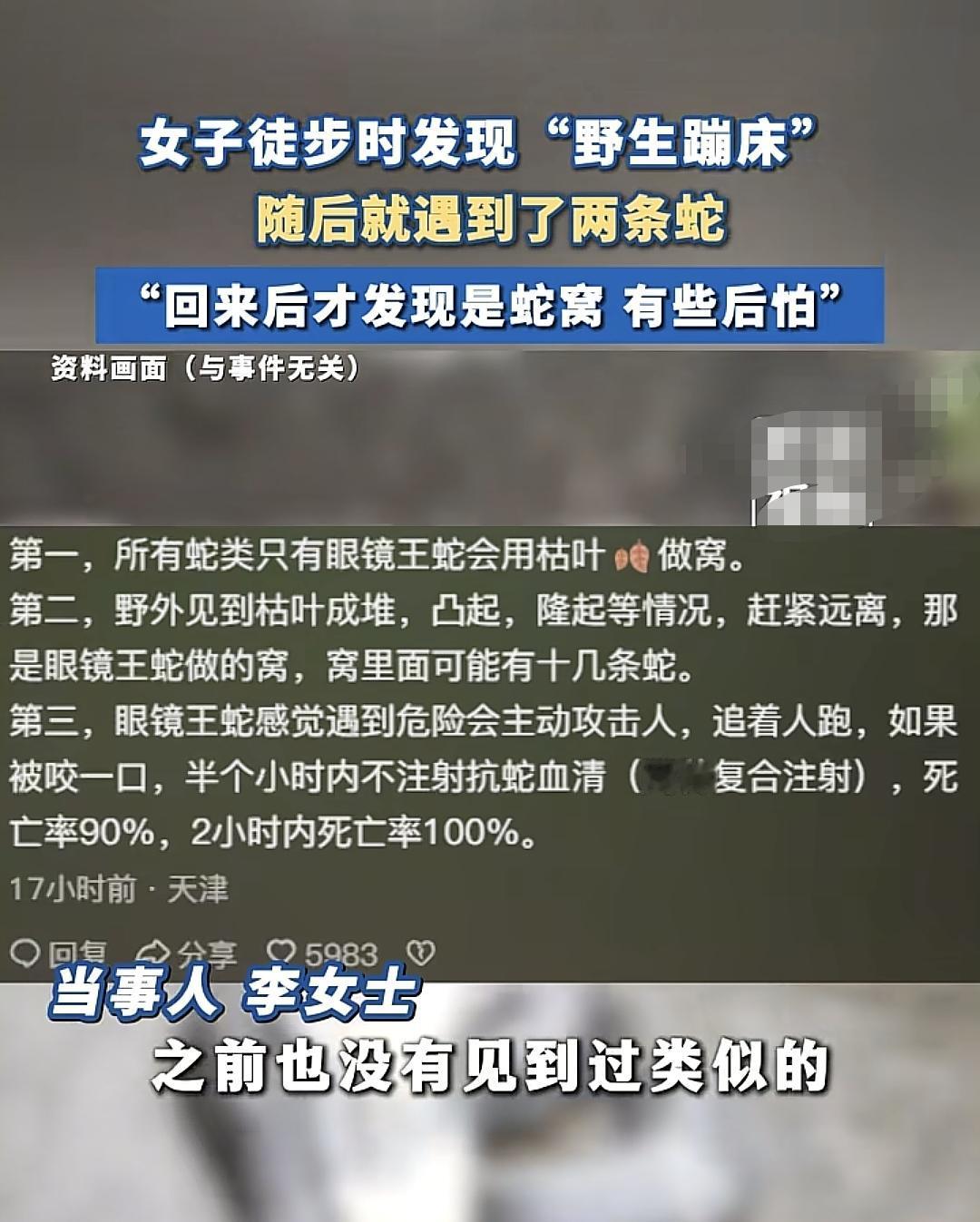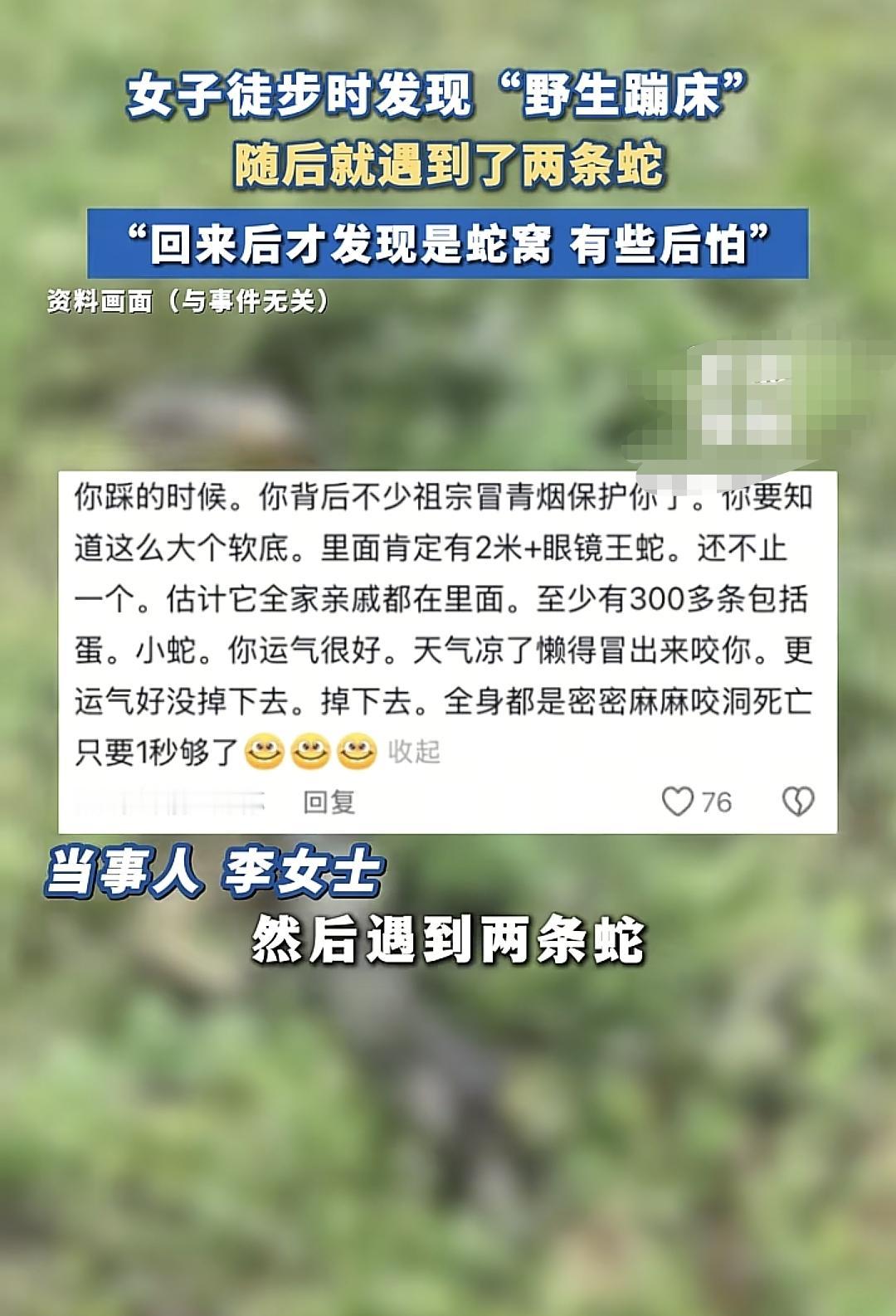 活了几十年居然看到有人在蛇窝蹦迪 这真的可以吹一辈子了! 这位李女士也是挺可爱的,她说“我觉得这块地方软软的,很神奇”,真是不知者不畏,在上面蹦蹦哒,开心的不行,直到看到出来两条蛇才吓得逃跑 说实在的,这种满是枯枝败叶的地方,那么厚,就算不知道是蛇窝,那也怕掉进去呀,万一下面是泥潭或者陷阱呢 像这种地方也怕是人家夹野物的夹子装在里面不是,或者下面是个大洞用树枝伪装着呢! 有经验的小伙伴说“还好现在天冷了,蛇懒得出来咬你,你就蹦吧,这么大的窝子.底下至少得上千条蛇,若是在夏天掉下去,秒挂”! 还有人说“这种窝子那可不是一般的蛇,里面肯定有2米➕眼镜王蛇,下面他家亲戚估计不少,至少几百条,冒出2条那都是警告你赶紧离开,够义气了”! 一般蛇类,只有眼镜蛇是用枯叶做窝,一定要记住了! 像这种地方,就算我也不知道是蛇窝,但常识告诉我那地方危险,这女孩是真有福气,估计下面的老祖宗把能求的关系,都求了一遍,不然你都回不来。 也不知道这过山峰会不会闻着她的味道追过来,她需要逃吗?