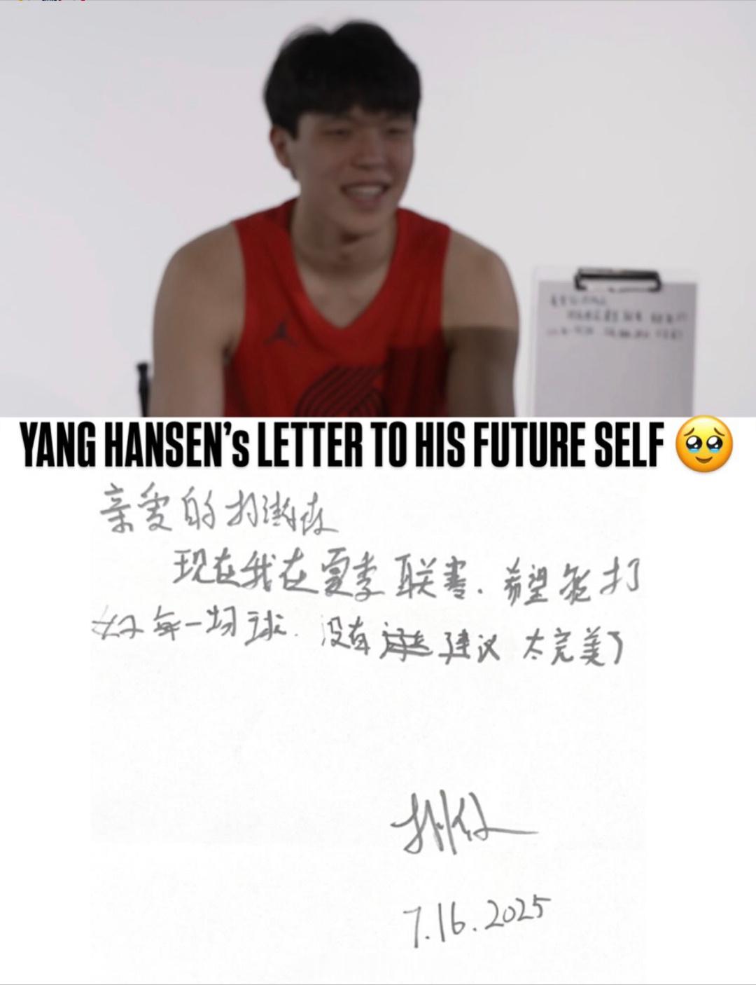 亲爱的杨瀚森:现在我在夏季联赛, 希望能打好每一场球,没有建议,太完美了。