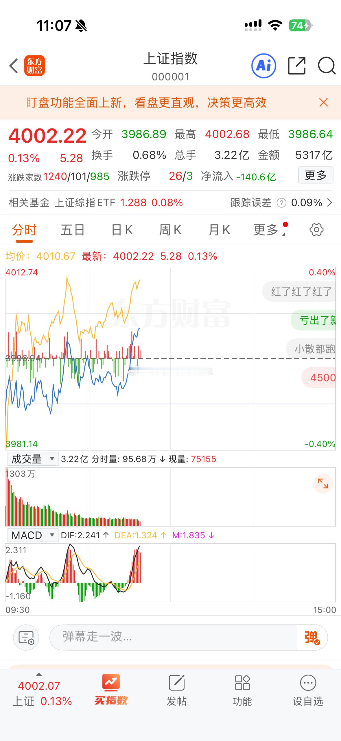 前面摸了一下4000点后回落,现在又摸上4000点了,盘感上这次有力度多了。