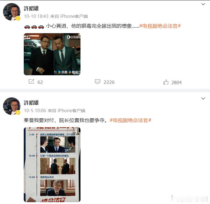许绍雄最后一条微博许绍雄去世 许绍雄10月10日还在微博上宣传新剧《绝命法官》。