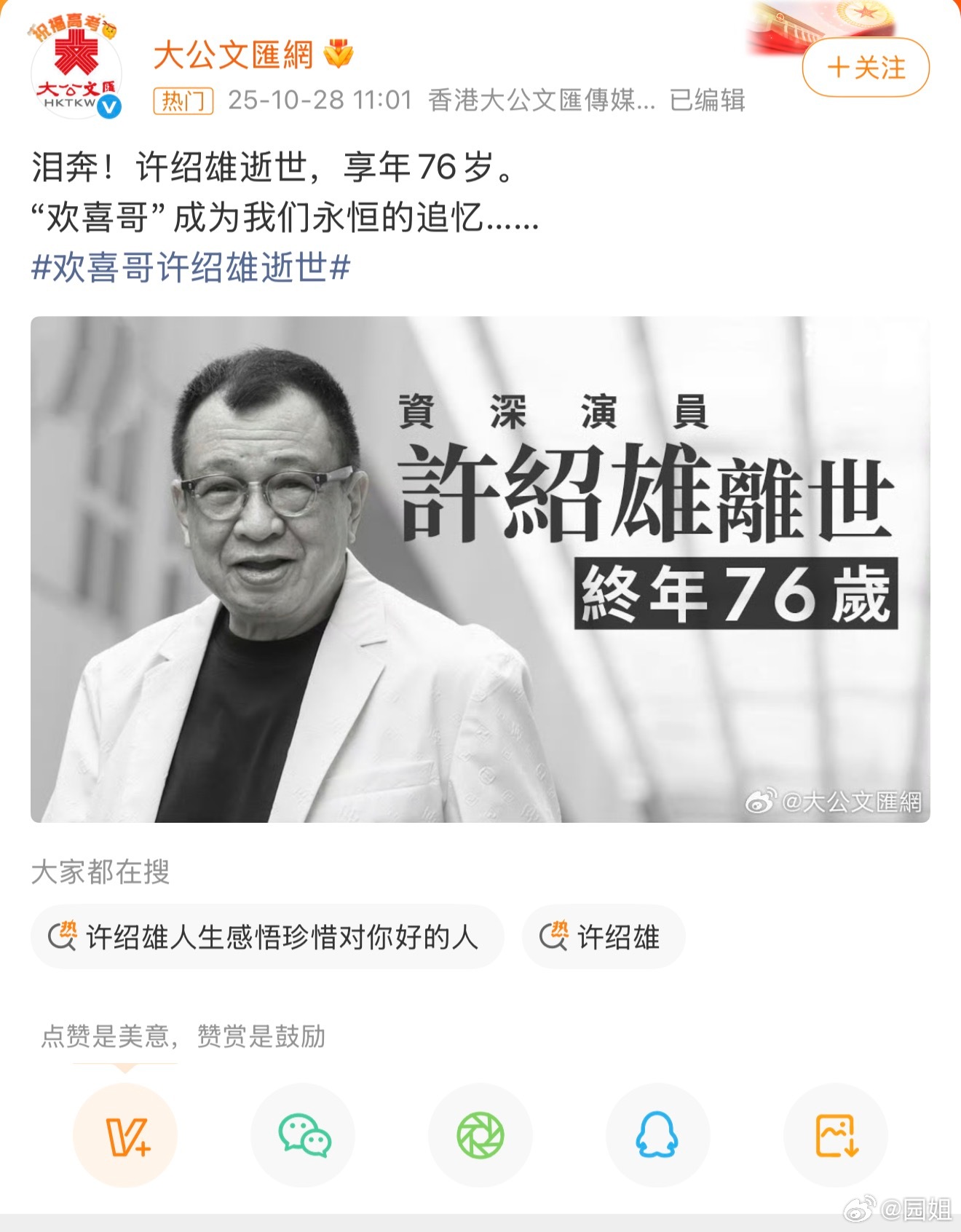#欢喜哥许绍雄逝世#以前很喜欢的一批TVB演员越来越少了,记忆中很多香港电影都能看到许绍雄的角色,以后再也看不到了[蜡烛]