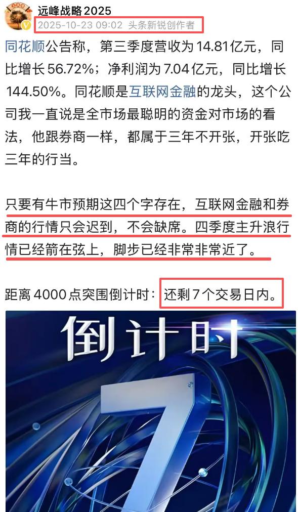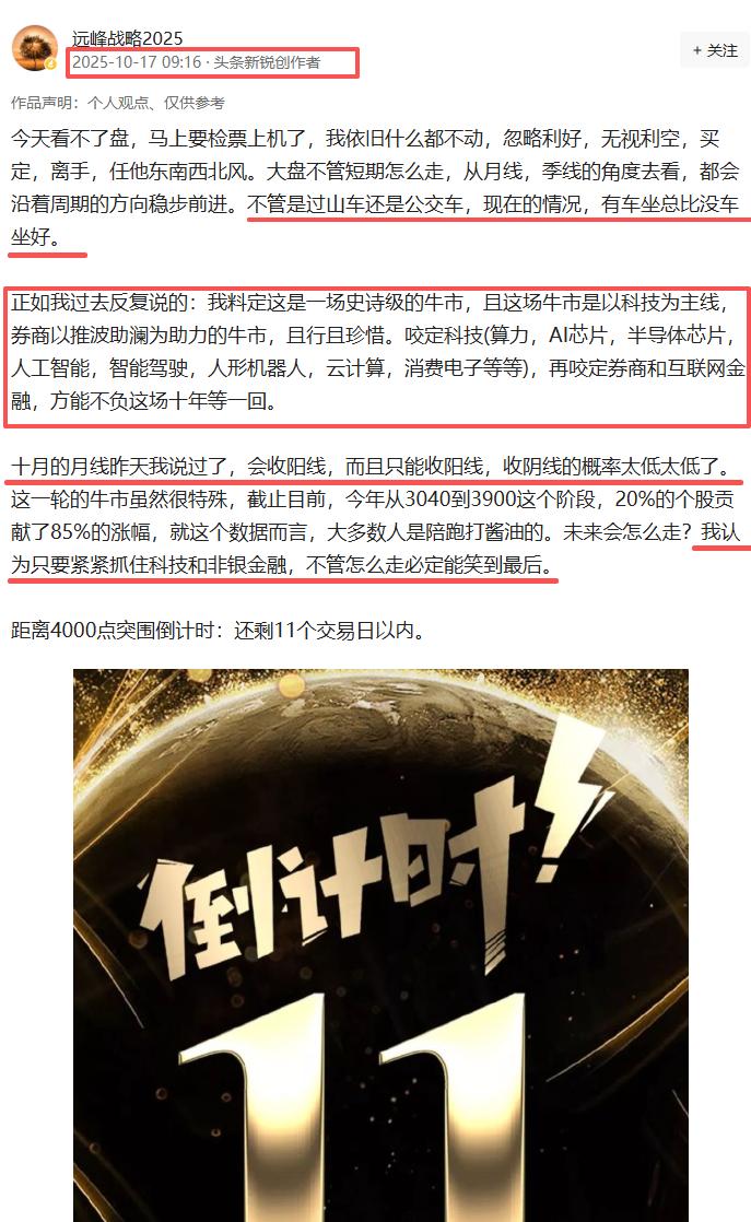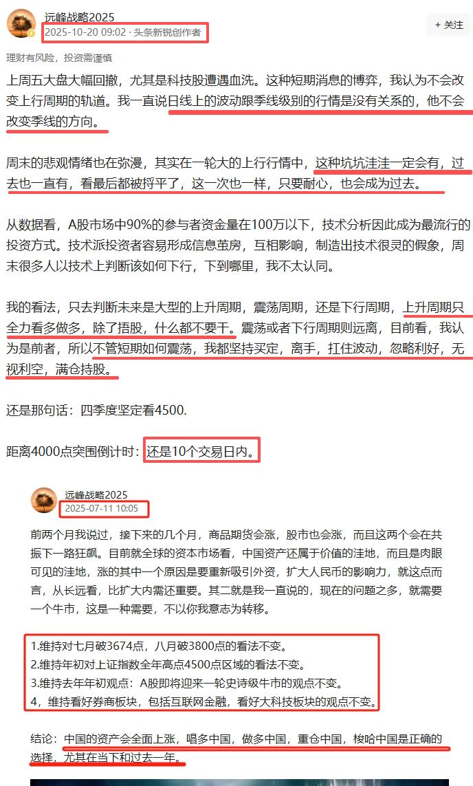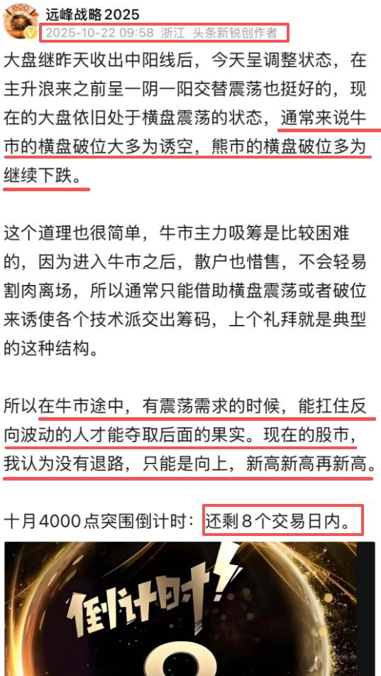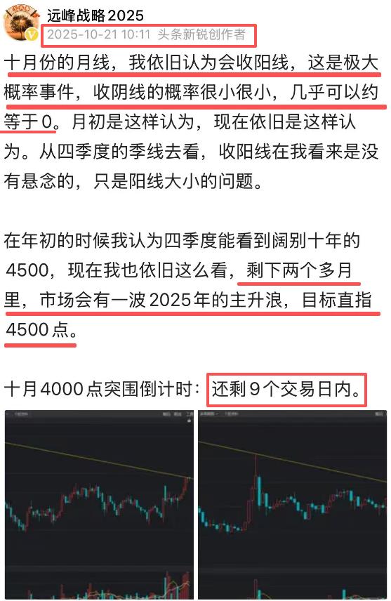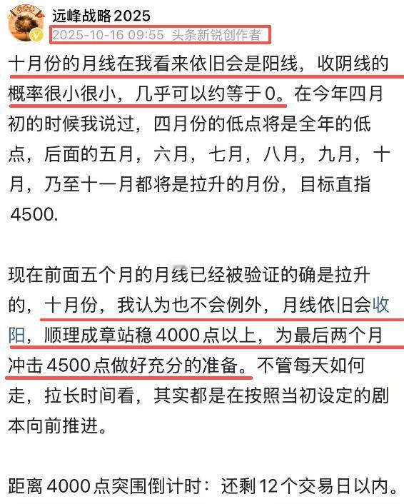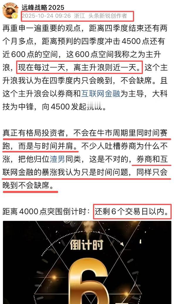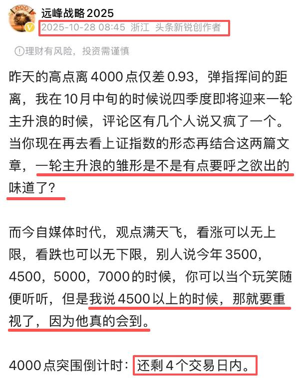 再次见到阔别十年之久4000点,本次的4000点突围倒计时顺利完成。至此今年的关键点位3439,3674,3900,4000等四次倒计时计划均成功抵达。在本月14日超4000加下跌,科技板块雪崩之际,本次的倒计时启动于次盘前,不少朋友发信让我不要那么激进,这次难度太大,不想看到我被打脸。对于这些朋友的关心,我表示真诚感谢。 模棱两可,瞻前顾后从来都不是远峰的风格,趋势起,则金戈铁马,气吞万里如虎,牛市起,则全面看多,无惧震荡调整,这才是我的气场。 逆时不吐心中苦,顺时不忘来时路,再回顾一下这些倒计时文章,轻舟已过万重山,我认为还是值得反复看的,有了过往的经历,才有面对未来的心态。 你们中途被吓出去了吗?还是一路也坚持下来了?