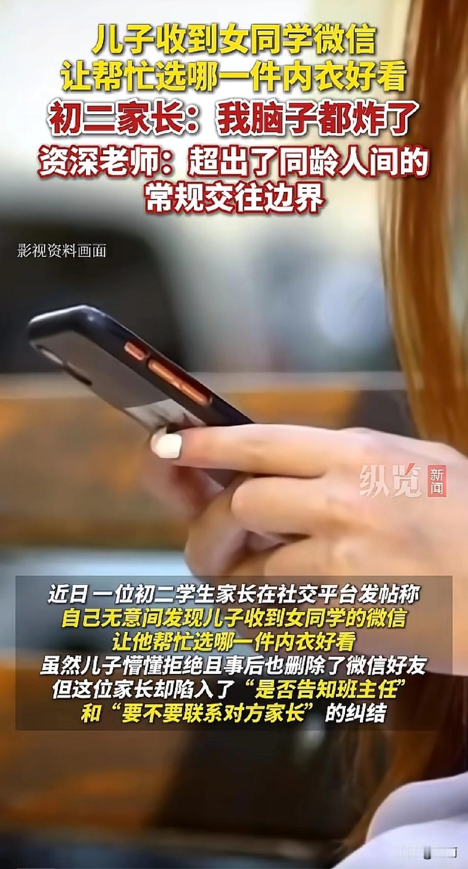 一位初二学生家长发现儿子收到女同学微信,对方发了两张内衣商品图,让帮忙选哪件好看。 儿子懵懂拒绝,说“我一个男的怎么知道”,之后还删了好友。可家长犯了难,纠结要不要告诉班主任、联系对方家长。 初二是青春期早期,孩子对异性好奇、想交朋友很正常。但女生发内衣选款图给男同学,确实超出了同龄人间的正常交往边界。 这事儿也提醒家长,得早点跟孩子聊聊交往的边界感。不管是男孩女孩,都得让他们知道哪些话题、行为不适合在异性同学间出现。不用过度紧张,但正确引导肯定少不了,这才是对孩子负责。
