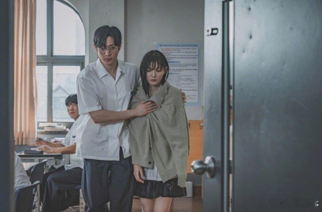 公开的剧照中,白雅珍与尹俊瑞之间的氛围充满淡淡的怦然心动。在两人的学生时代,白雅珍浑身湿透,被尹俊瑞拥在怀中走出教室。在两人的关系中,尹俊瑞虽然不曾正面出头,却始终在她身后默默守护。