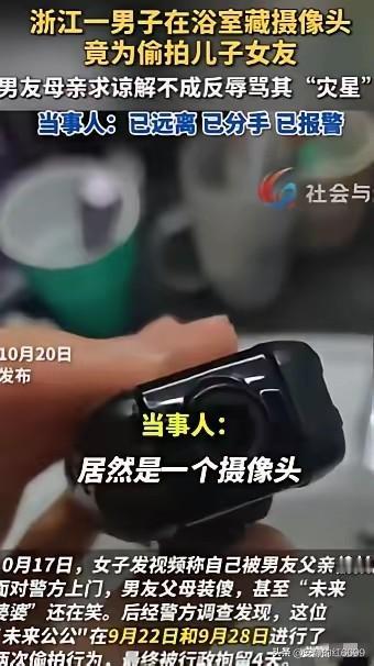 “太荒唐了!”浙江,近日,一名女子在网上发视频称,她在男友家洗澡的时候,被男朋友的父亲用针孔摄像头偷拍,未来婆婆跟男友不仅不责备他,反而当没事发生一样,未来婆婆甚至还骂她“扫把星”,破坏他们家的和谐。 9月的某一天,李女士在男友家洗澡的时候,伸手想在洗漱台拿面膜,手背无意中触碰到了发烫的电动刮胡刀。她觉得电动刮胡刀放在洗漱台,没有用会发烫,觉得有些奇怪,所以拿起刮胡刀仔细观看,却惊讶的发现,刮胡刀内藏着一个针孔摄像头,摄像头的方向正对着她洗澡的方向。 李女士发现刮胡刀的秘密之后,非常生气,赶紧穿好衣服走出来,把这件事告诉男朋友的妈妈。没成想,男朋友的妈妈一脸的淡定,还说没多大的事,可能是老头子闹着玩的。 眼看男朋友的妈妈没把这件事当回事,李女士越来想越生气,回到房间之后,马上拿起手机打电话报警。 民警很快赶来处置,经过对电动刮胡刀的检查之后发现,李女士未来的公公在9月22号日跟28日对李女士进行了偷拍,连接的正是家里面WiFi。 面对民警的电话询问,李女士未来的公公一会说自己刮完胡子忘了带出来,一会又说刮胡刀不是自己的。最终在大量的证据面前,李女士的未来公公最终被民警传唤,最后被拘留四天。 令李女士感到寒心的是,未来婆婆怪她打电话报警抓走了她的丈夫,说她是“扫把星” ,破坏了他们家的和谐。男友也觉得李女士小题大做,不应该因为这件事打电话报警,令他们家丢了脸面 李女士最终做出决定,坚决跟男友分手。后来男友带着全家人前来道歉,求李女士回心转意,但依然没有改变李女士要跟男友分手的决定。 这件事荒唐的地方就是,自己的女朋友被自己的父亲偷拍,男友不仅不护着自己的女友,还帮着自己的父亲说话,这也难怪女友这么生气要跟他分手。如果李女士以后嫁进这样的家庭,大概率是不会幸福的。 那么你们觉得,李女士因为被未来公公偷拍,选择报警这件事做的对吗?秋日生活打卡季 消息来源:社会与法