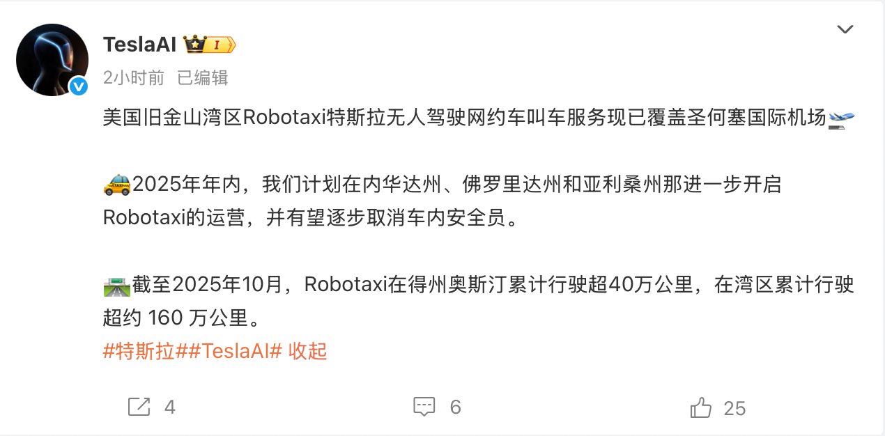 截至2025年10月,Robotaxi在美国得州奥斯汀累计行驶超40万公里,在加州湾区累计行驶超约 160 万公里。