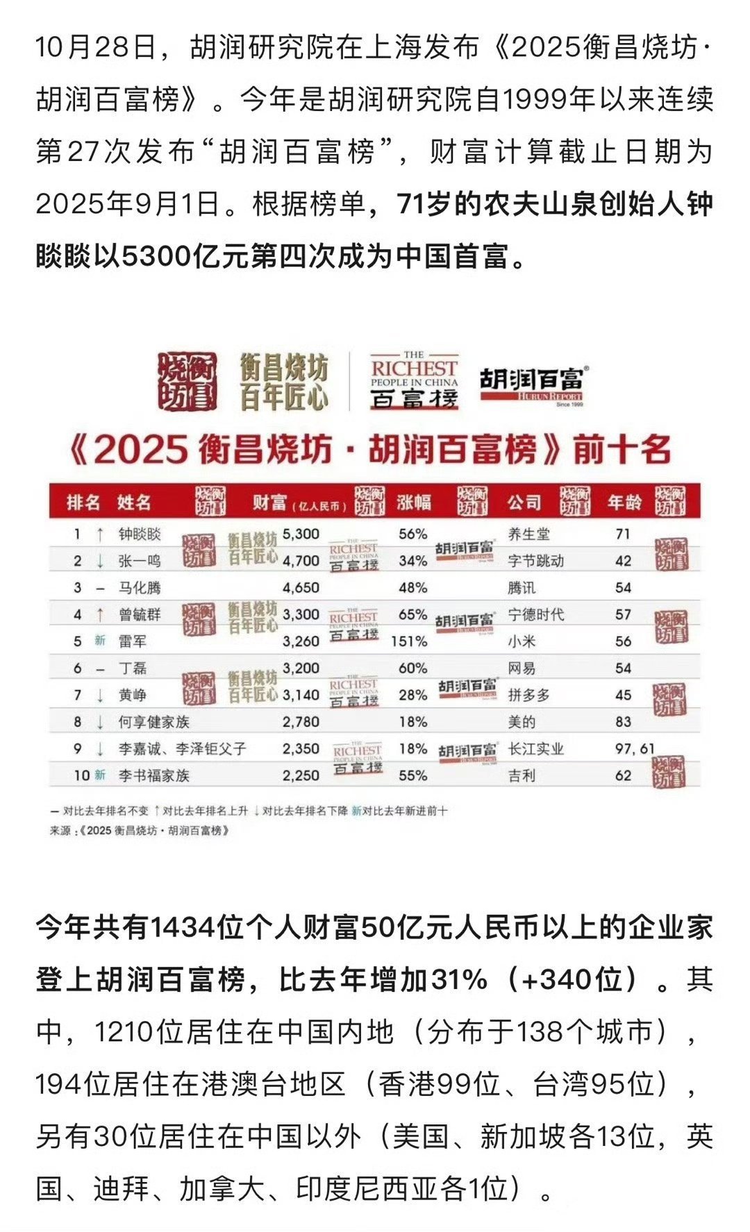 胡润富豪榜又发布了,农夫山泉的老板钟睒睒第四次登顶首富。