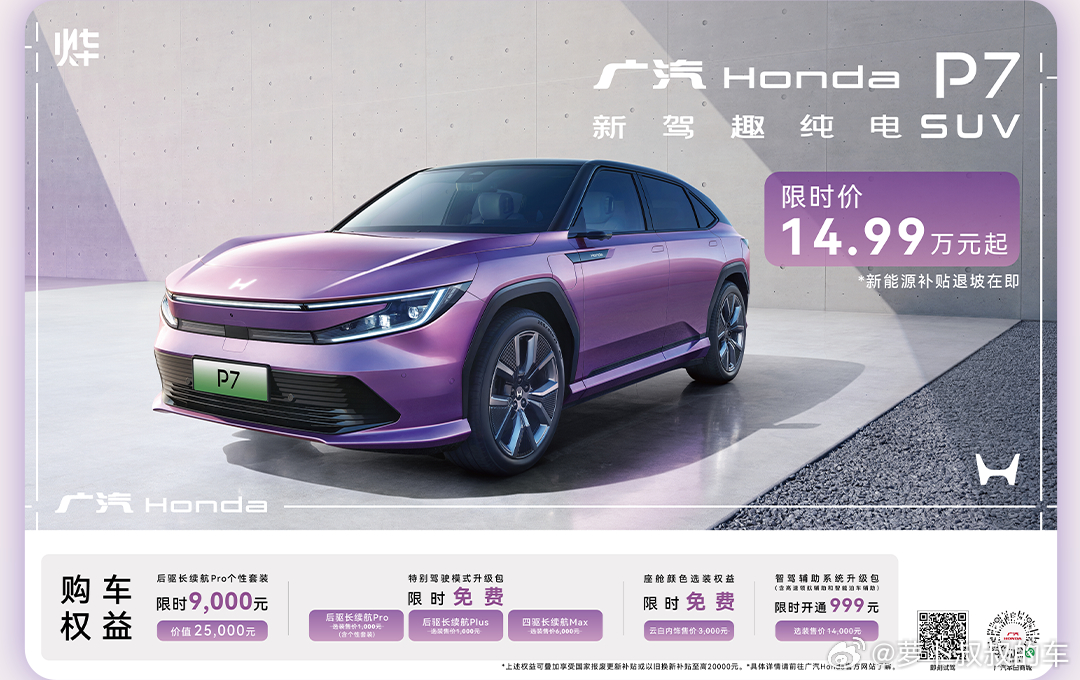 直降10万元,广汽本田大酬宾,纯电动SUV烨P7,限时价只需要14.99万元,赶紧抢吧。