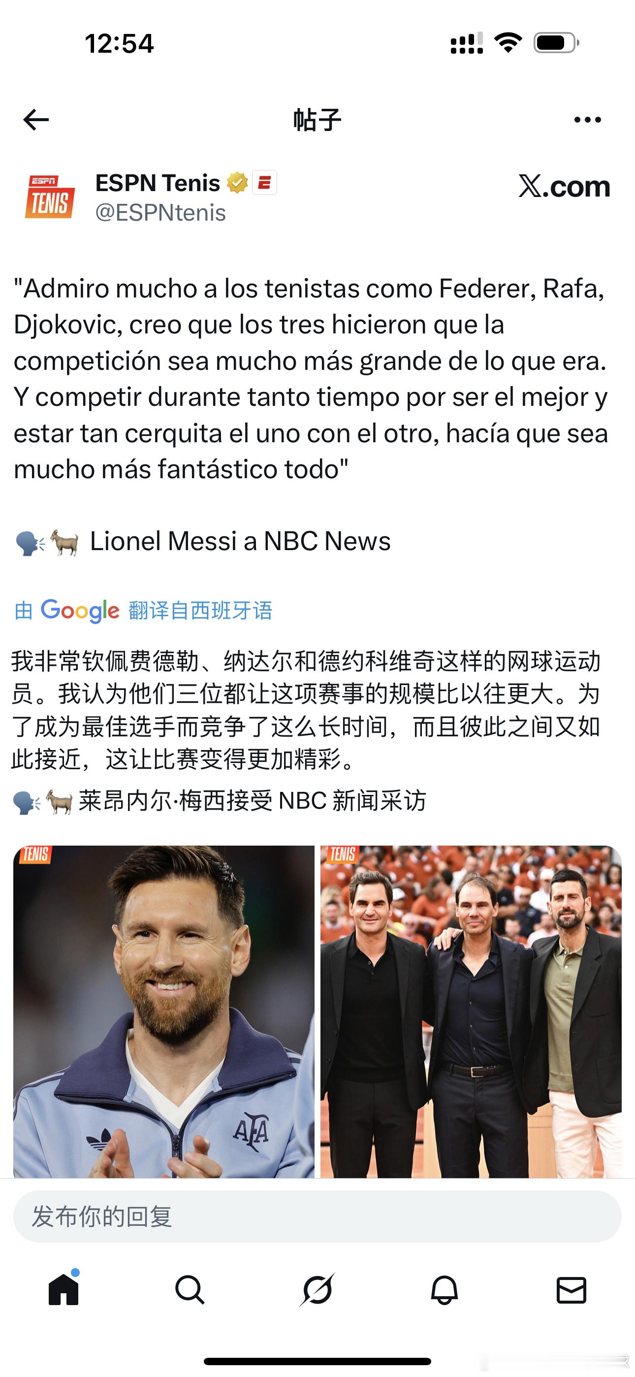 阿根廷🇦🇷足球巨星梅西夸赞网坛三巨头