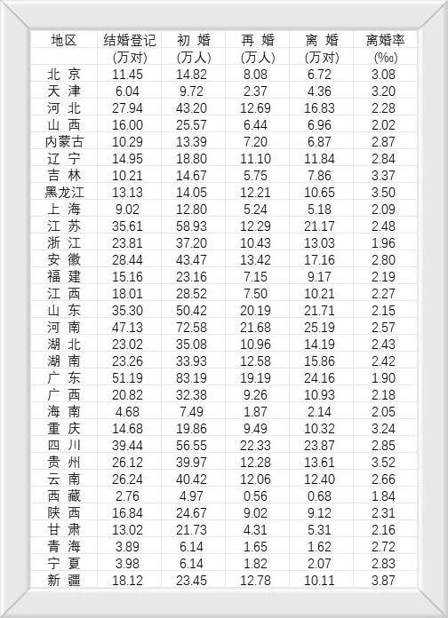 2024年全国31省(市、自治区)离婚率最低是西藏