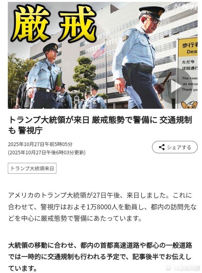 美国总统特朗普27日下午抵达日本。与此同时,警视厅动员了约1万8000人,以东京都内的访问地点为中心严阵以待。