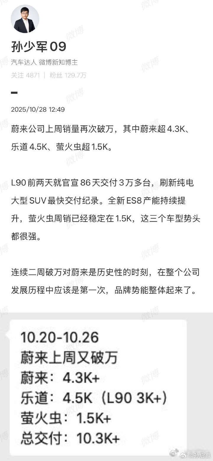 蔚来上周销量过万,销量是越来越好,逐渐变成畅销。可惜现在没了周榜,有点遗憾啊[允悲]