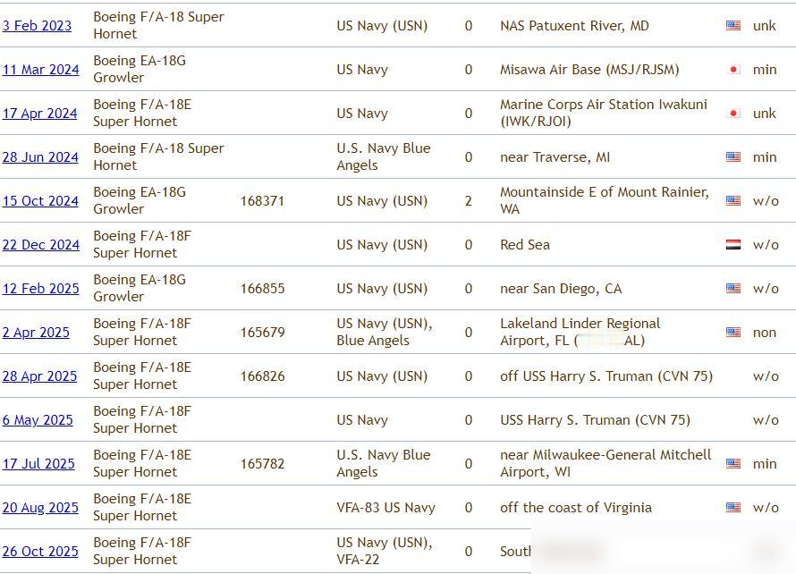 美军坠机了,很多遥遥领先党肯定特别兴奋[狗头][狗头][狗头] 其实吧,我有每一架F-18E/F/G坠机的资料。目前超级大黄蜂家族共生产超过632架,坠毁了49架。 光看坠机数容易上头,但比飞机安全不能光数摔了多少架。得看飞得多勤、风险多高。美军的F-18这几年没闲着,打也门、盯伊朗,飞行小时数怕是J-15的几倍。J-15主要跟辽宁舰山东舰练练起降,实战压力根本不在一个级别。 再说飞行员伤亡比例。J-15摔了4架,两名海航飞行员牺牲,一半没了。美军F-18摔了49架,阵亡15名飞行员,活下来的多。这里头弹射座椅、逃生系统差距不小。听说F-18用的马丁贝克座椅,救过不少命;咱们早年歼-15的国产座椅是不是拖后腿了?后来换新型号才好点。 最近一年美军连摔6、7架F-18,有人说飞机老了,到寿命了。但翻翻数据,F-18Block III去年才交付,新的也摔。更像是任务太密,保养跟不上。胡塞那边天天打无人机,美军航母舰载机疲于奔命,故障率自然飙高。 反过来看J-15,飞得少、任务轻,数据好看但不经打。真要拉到红海那种高压环境,能不能扛住难说。不过舰载机本来就是体系作战,比单机安全性不如比整体战斗力。福建舰电磁弹射配歼-35,以后格局可能不一样。 总之,摔飞机不能光看热闹。美军是用出来的风险,咱们是练出来的安全。真要比,得等咱们的舰载机也经历几次实战考验。