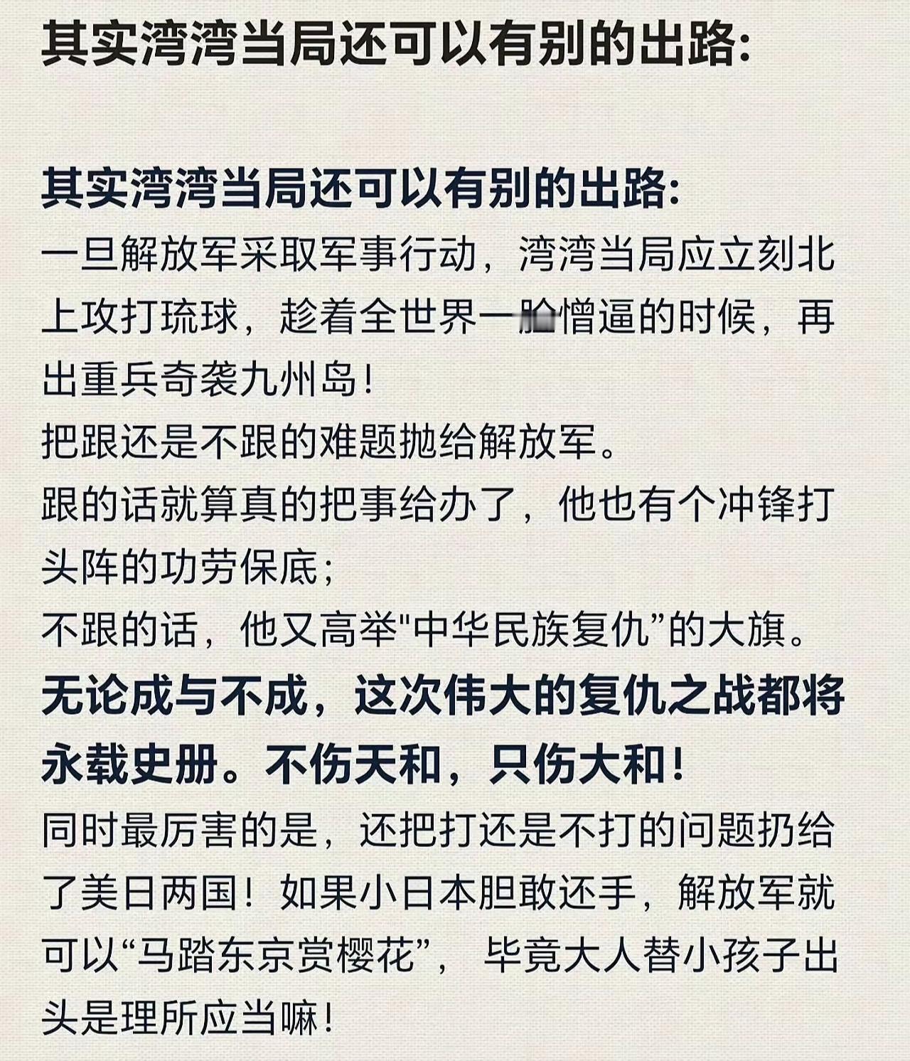 兵行险着!出其不意的打法乃兵家至宝!个人认为,这是一个可行之策,望湾湾的将领们认真研究一下,名垂青史的机会来了,机不可失,失不再来,该当机立断也![捂脸]