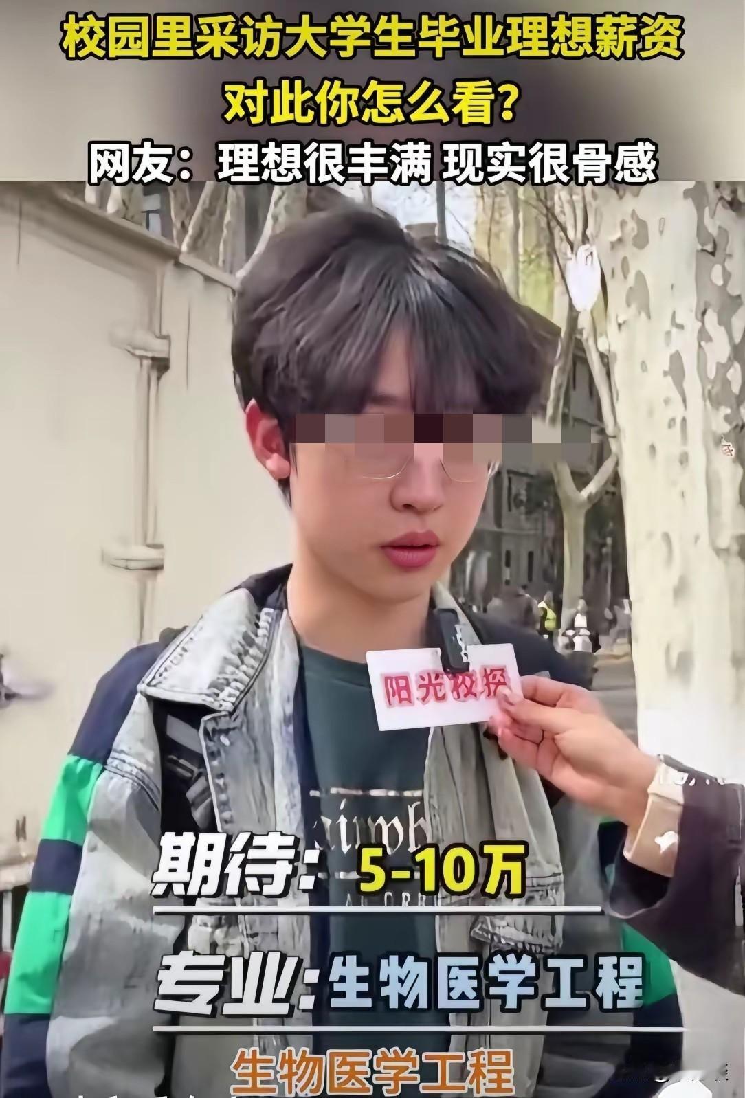 部分在校大学生对未来薪资的期待开口就是 5~10万或者八九千,他们的理想确实很丰满,但是现实却很骨感,他们没有经历过现实的拷打,根本不知道现实是多么的残酷。 他们期待的工资,与他们真正的工资可能是10倍的关系,能够拿到5000的工资就已经非常了不起了。现在的市场行情就是这样,特别是在现在经济情况下,就业都已经是一个很大的问题,更别说像高工资的就业了,并不是每一家企业都能够愿意拿出5万到10万来招聘没有任何工作经验的大学生。 有这么多钱为什么不招聘有工作经验的人呢?为什么要花在刚大学毕业的人头上呢?绝大多数企业不会这么做的,他们会算一笔账,这样很不划算,而且得到的回报也不会对称。这些大学生之所以会有这么美好的憧憬,那就是因为他们对未来根本没有清晰的认知,他们在象牙塔待的太久了,他们不知道现在社会里到处都是大学生,一般大学生已经不值钱了,只不过他们还生活在象牙塔