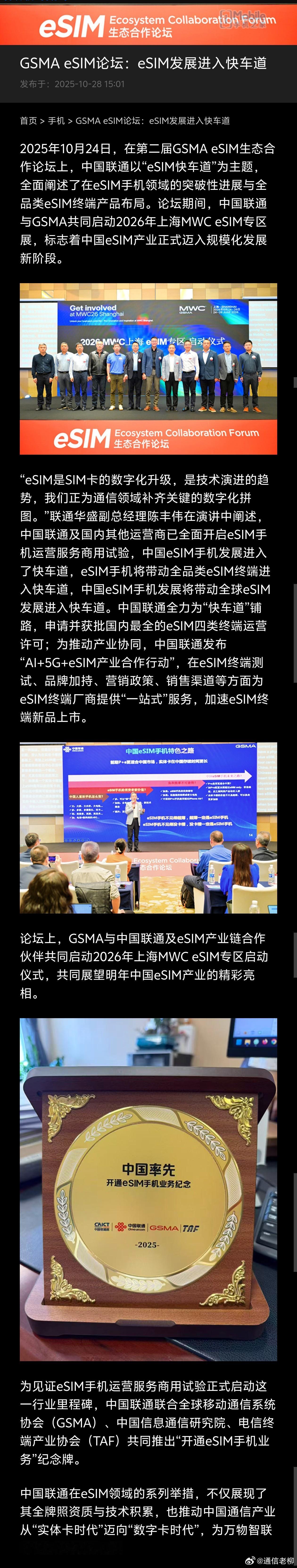 中国出场,规模要上!2025年10月24日,在第二届GSMA eSIM生态合作论坛上,中国联通以“eSIM快车道”为主题,全面阐述了在eSIM手机领域的突破性进展与全品类eSIM终端产品布局。论坛期间,中国联通与GSMA共同启动2026年上海MWC eSIM专区展,标志着中国eSIM产业正式迈入规模化发展新阶段。
