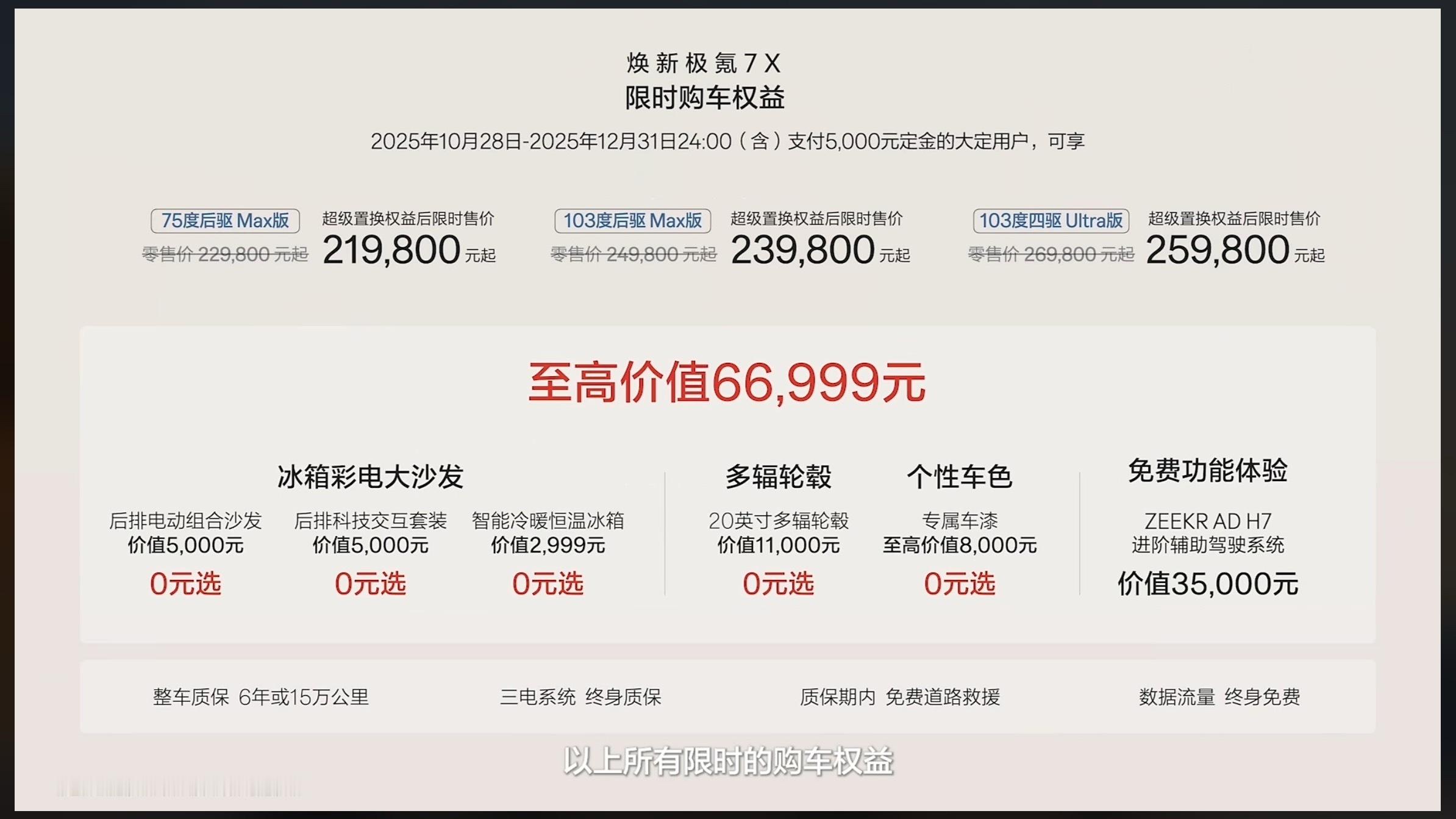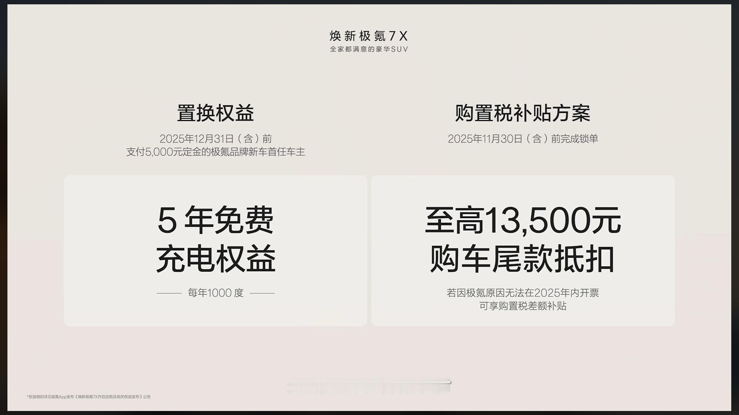 另外老车主还有每年1000度电的充电权益(共5年),可以说,这个诚意真的相当到位了。特别是对于家庭的需求,冰箱、彩电、大沙发现在首发都已经是免费,焕新极氪7X家庭豪华新标杆确实没有吹牛哦!