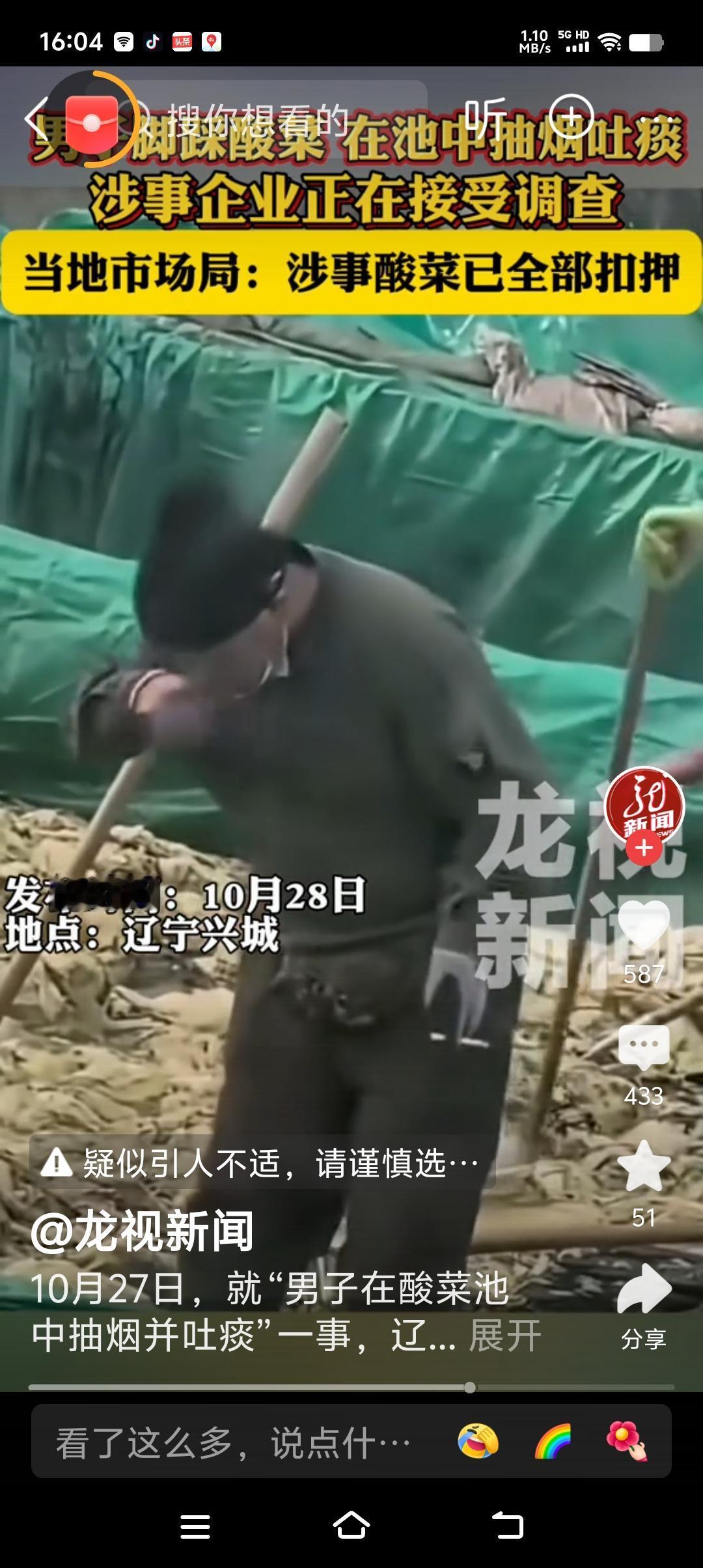 原来不准备腌酸菜了,可是看到这个视频,我下定决心还是要自己腌酸菜! 在过去东北人每年冬天家家户户都要腌上一缸酸菜, 现在大多也是盐酸菜的,不过多数是住在地方的人家腌酸菜,住楼房的人大多要去超市买酸菜 ! 一直视频看了之后,让人确实感到恶心,一个从酸在此中总用叉子往出捞酸菜的工人不但一边干活,一边抽烟,而且还往酸菜池里吐痰,担心被看到还用脚把痰迹弄没,看着太恶心了! 这个工人良心坏了! 随后在10月27日,事发地辽宁省兴城市市场监督管理局发布情况通报,称该批次酸菜已被全部扣押,未流入市场,并将按照相关操作规程销毁。 这是有视频流出的,如果没有视频流出的,其他生菜酸菜的厂家会是怎样的操作,真是不得而知,市场上卖的酸菜,真是咽不下去! 真的不知道这段视频是怎样流出的,给把视频发出的人点赞,因为是他让人们认识到了酸菜在生产加工过程中的不为人知的肮脏一面! 食品加工如果不把好质量关,真是坑害消费者也会毁了自己的生意!