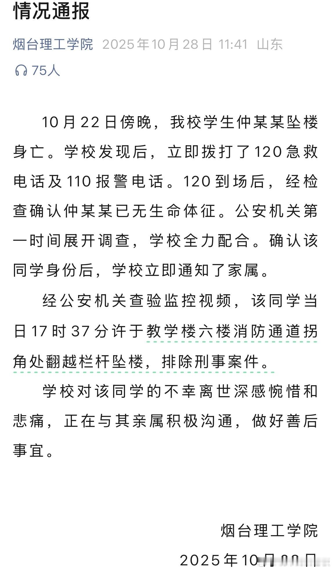 烟台理工学院通报学生坠楼身亡 看到这则通报,心里挺难受的——一个年轻生命以这样的方式消逝,实在太令人惋惜了。高校学生的心理状态,一直是容易被人忽视的角落,学校和家长真的要多多关注才行。