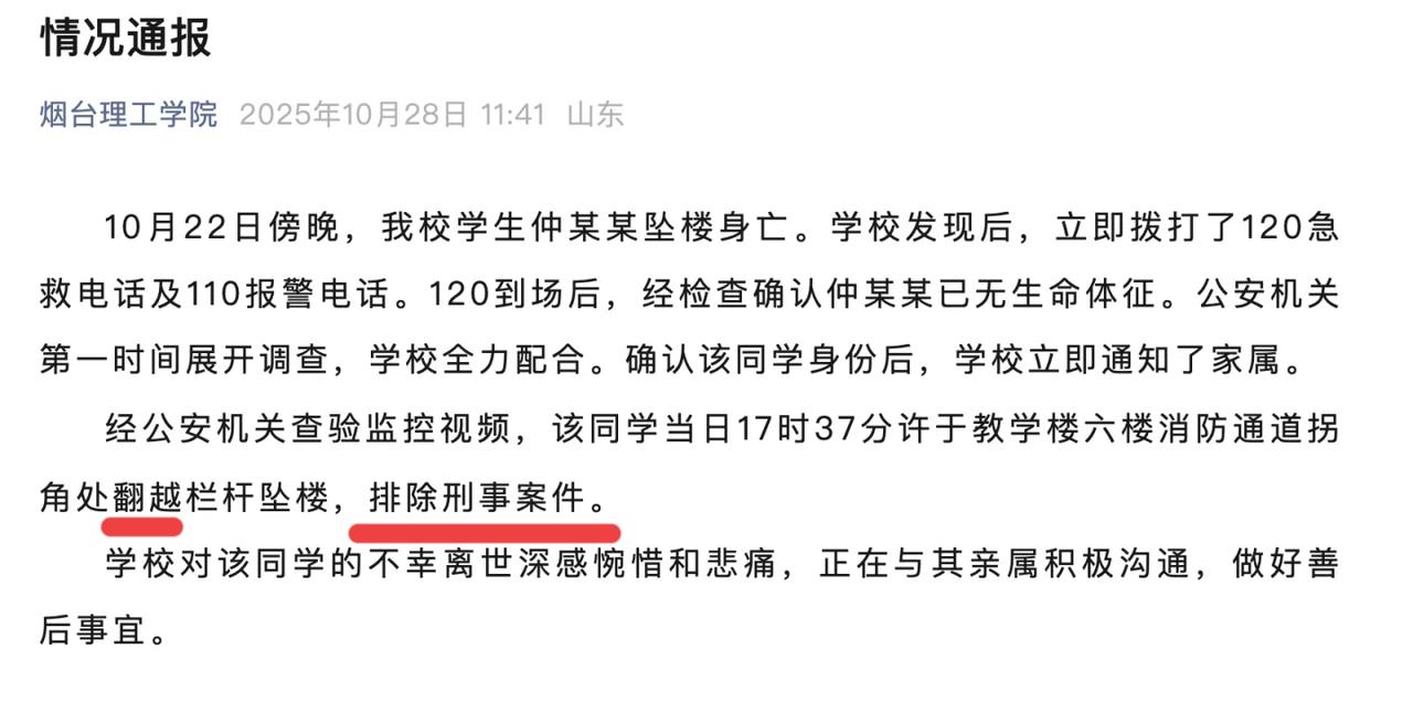 28号烟台理工学院对女学生仲某某坠亡一事发文,明确说该学生“翻越栏杆”,排除刑事案件。 从网友发的疑似出事地点照片来看,栏杆不矮,如果不是自己翻身过去,人是掉不下去的。 校方正在积极跟家属沟通,可辅导员心理也需要安抚啊!好端端一个学生没了,家属又来学校哭嚎。 刚开学没多长时间就出这样的事,不管什么原因,一个年轻生命逝去都会让人觉得可惜和难过。