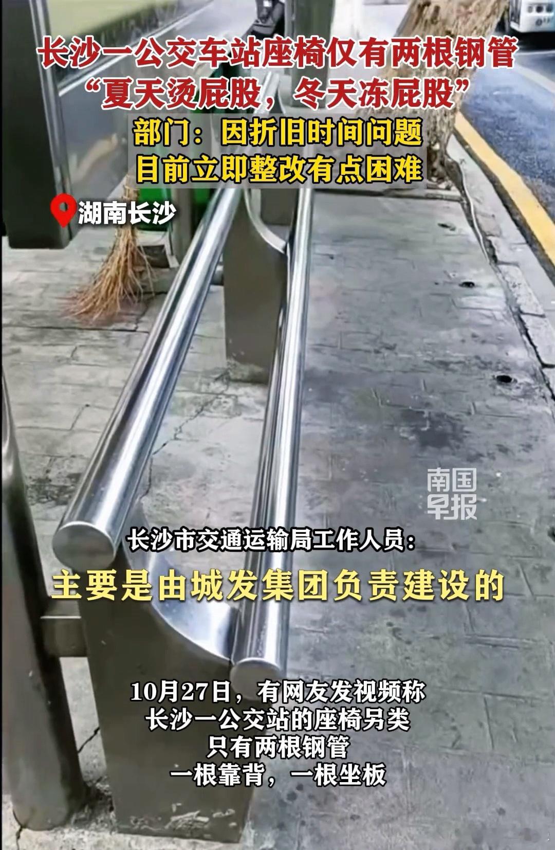 长沙一公交车站坐椅仅有两根钢管,坐椅目的难道不是方便普通人吗?这样的座椅竟然能被验收通过,除了恶心人没有任何作用