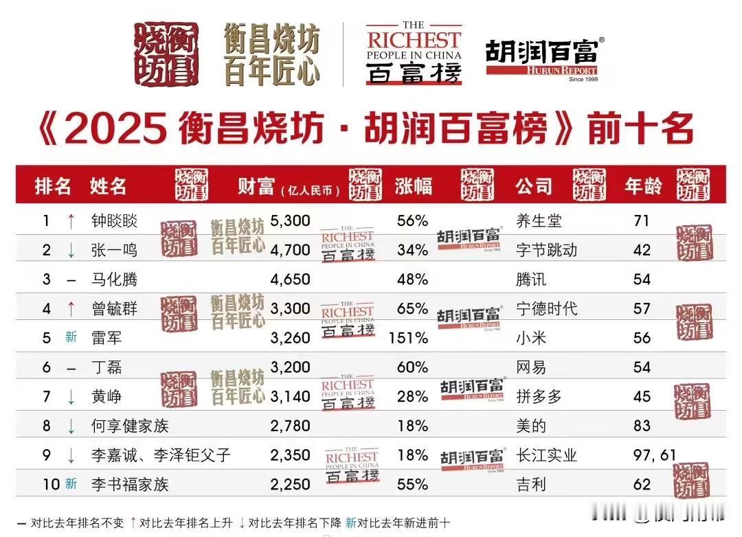 雷军成胡润百富榜增长王 10月28日《2025衡昌烧坊·胡润百富榜》发布,这届榜单相当精彩。1434位财富超50亿的企业家上榜,总财富接近30万亿,比去年增长42%。 71岁的钟睒睒以5300亿第四次成中国首富,旗下产品业绩给力。张一鸣因AI业务财富增1200亿,马化腾财富涨1500亿。而湖北籍企业家、小米创始人雷军成“增长王”,引发关注。今年上榜企业家财富增长远超去年,前十增长近1.4万亿,前八财富超千亿,贡献总财富增长的10%。不得不说,这些大佬们太牛了! 雷军创业金句 雷军小米市值 胡润全球首富 2025财富榜 胡润富人榜 小米集团市值 胡润财富排行榜
