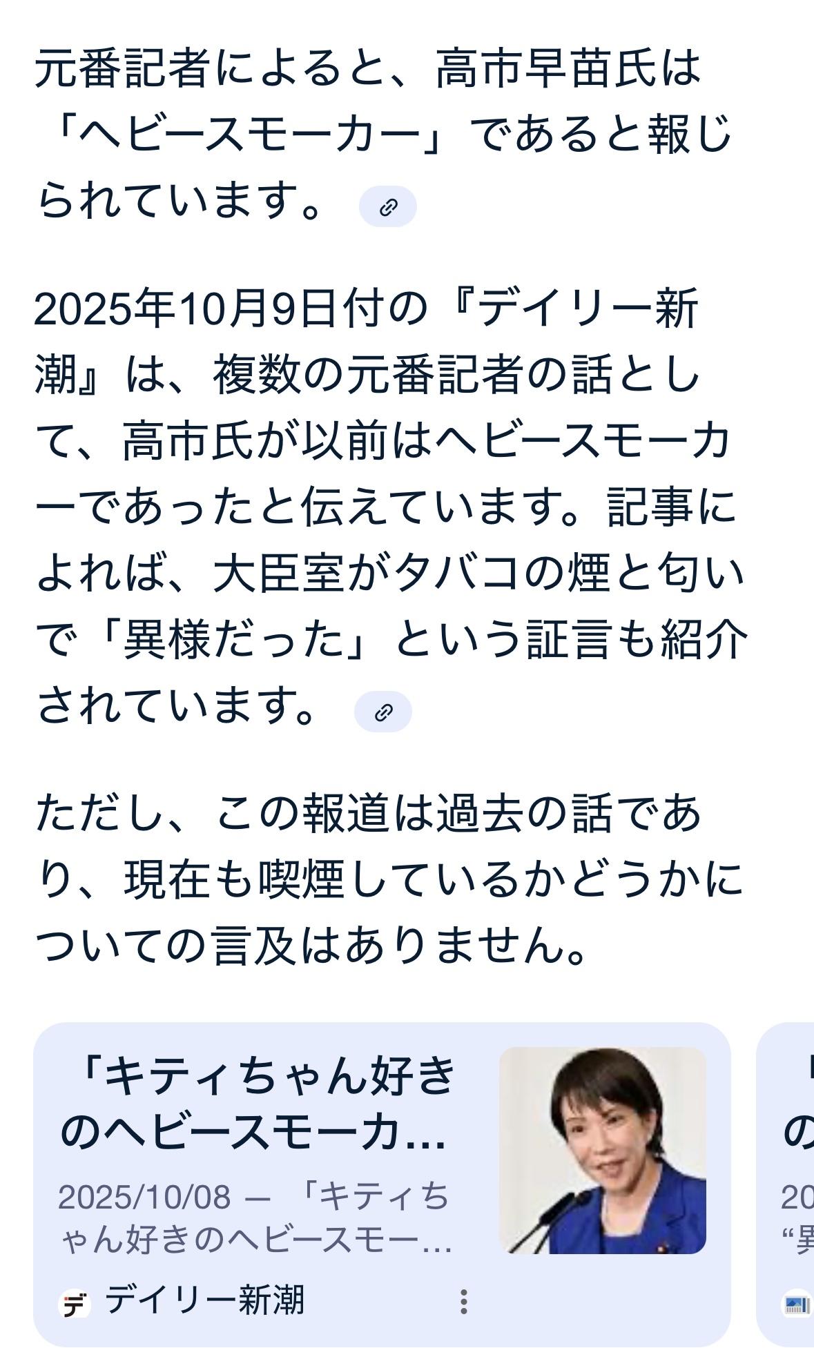 据一位报道高市早苗的前记者称,她“烟瘾很大”。 《每日新潮》2025年10月9日报道,援引多名前记者的话称,高市曾是一名烟瘾很大的人。文章还引用了证词,称部长办公室里弥漫着香烟烟雾和异味,让人感觉“很奇怪”。 然而,这份报道是过去的,并没有提及她是否还在吸烟。
