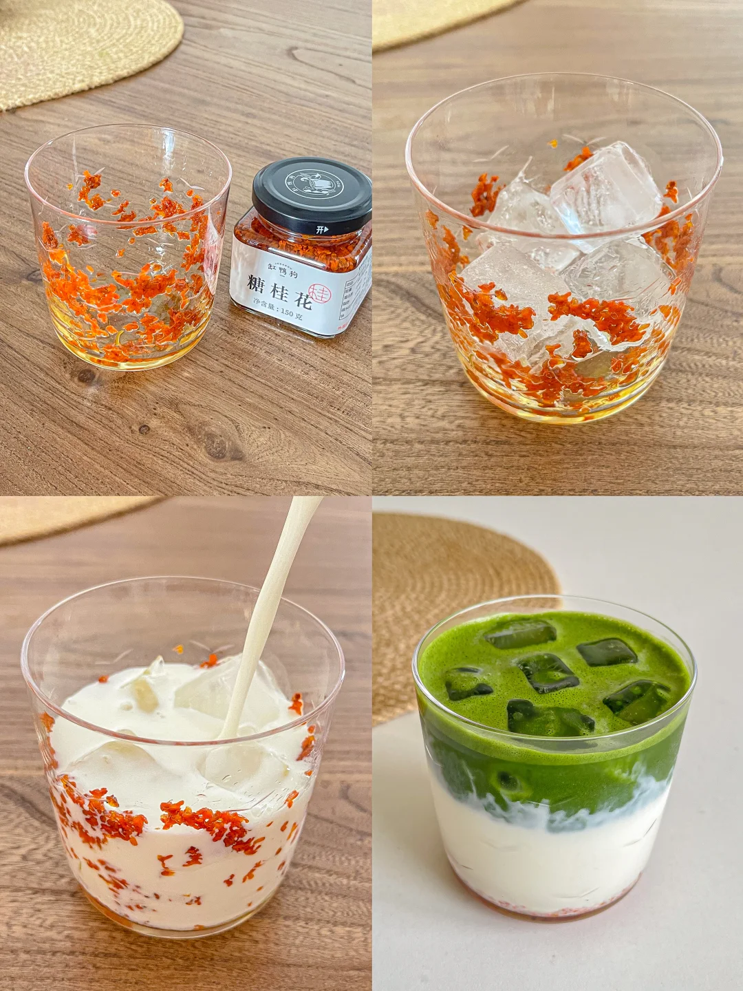 最近被桂花腌入味了!尝试了好多种糖桂花吃法 最惊艳的就是桂花抹茶拿铁🍵金晃晃的桂花挂在杯壁 加入冰块 牛奶 抹茶液 层次丰富 超治愈~