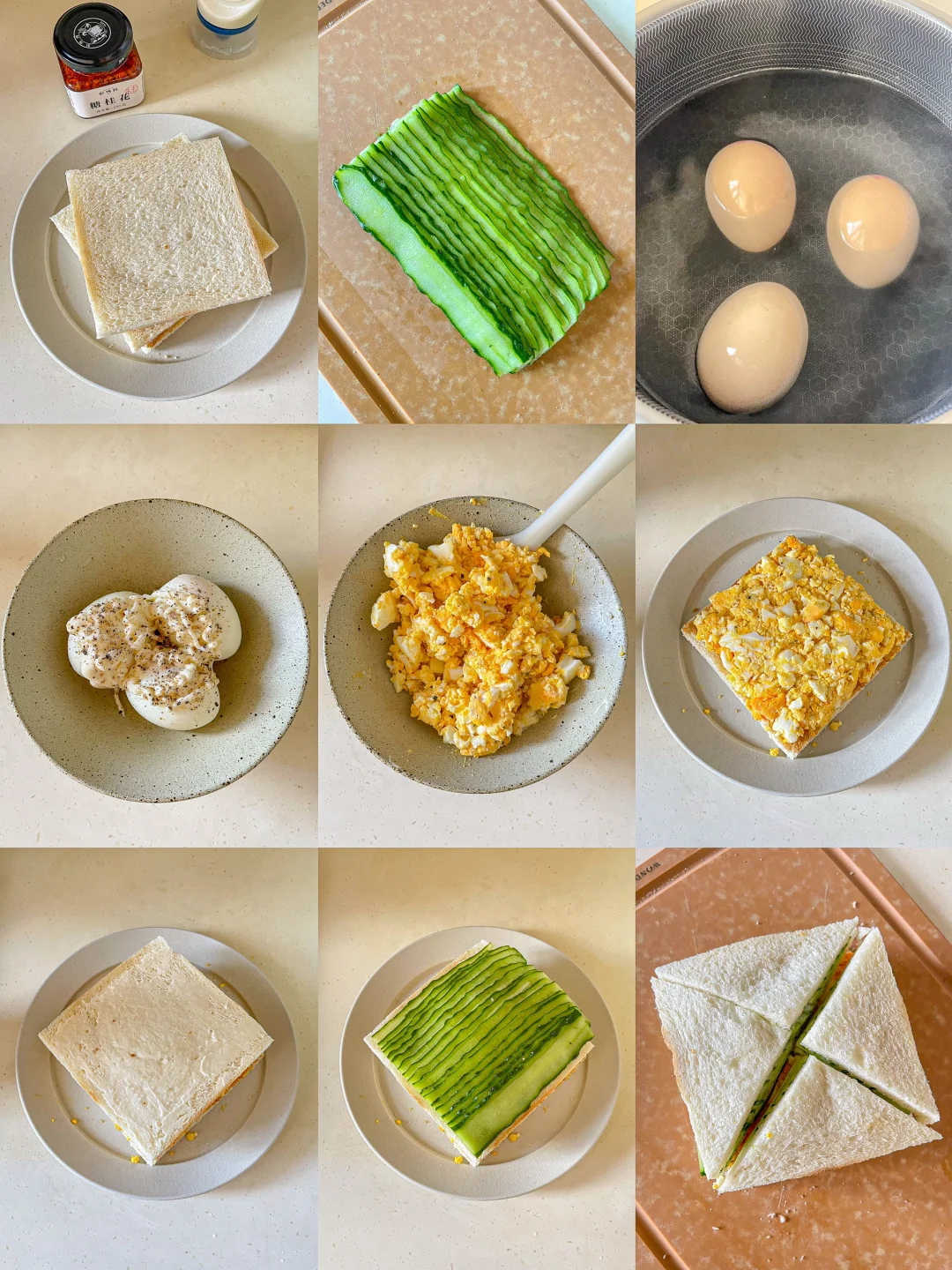 3.黄瓜切长片 和鸡蛋一起一次铺在吐司上 盖上吐司即可
