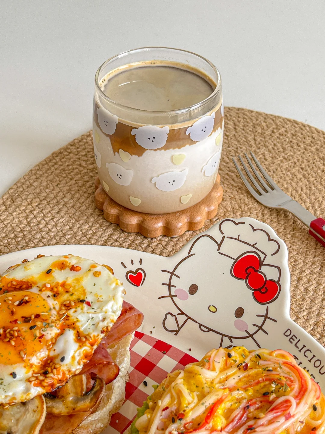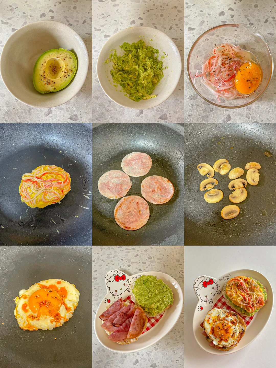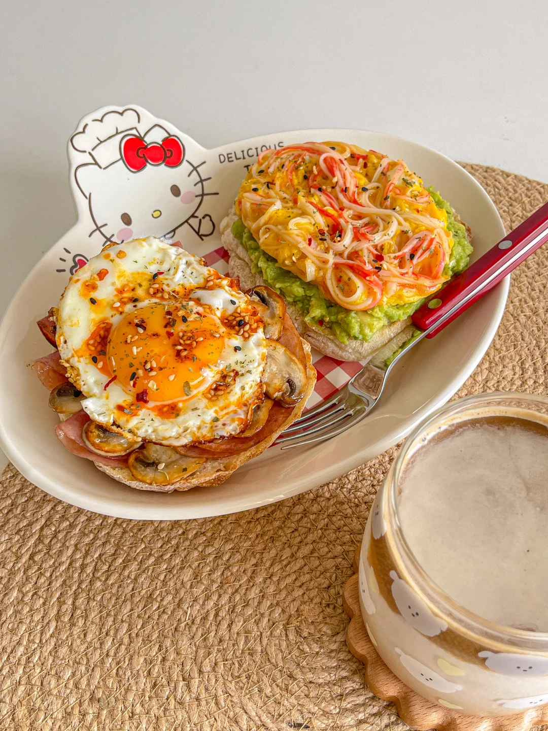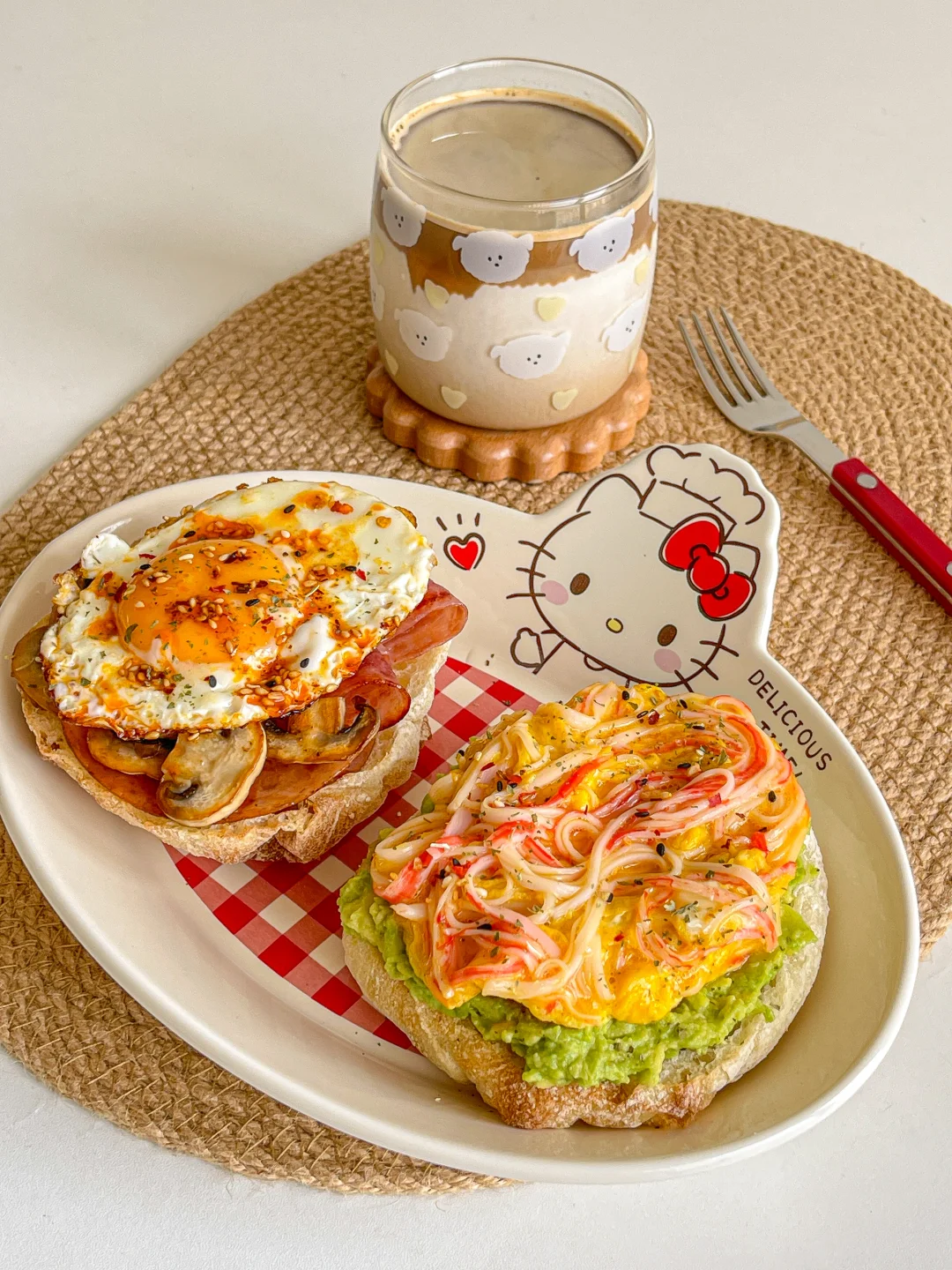 又到了清空冰箱的时间🍽️ 简单的三明治早餐 chao满足✌🏻 食材:🥪 恰巴塔➕火腿片➕口蘑➕油泼辣子煎鸡蛋➕牛油果➕蟹柳滑蛋 发现这个Kitty的盘子还挺适合装三明治的 双拼刚刚好!食欲和情绪价值都拉满‼️‼️