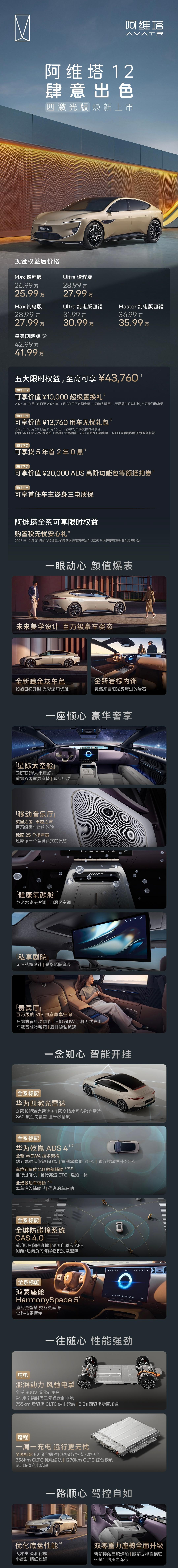 阿维塔12 四激光雷达+华为ADS 4.0全系标配,增程/纯电任选,25.99万起!了解详情自己看图。阿维塔12十二项同级独享
