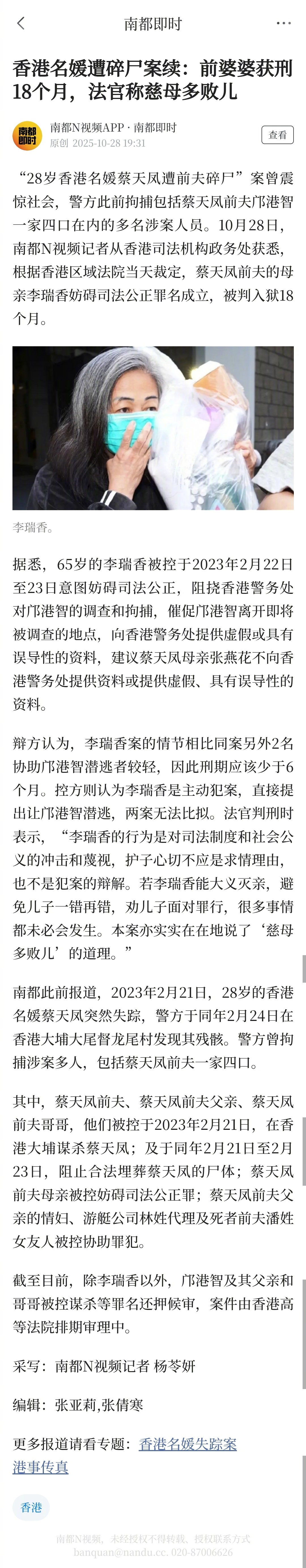 #香港名媛遭碎尸前婆婆获刑18个月#【香港名媛遭碎尸案续:前婆婆获刑18个月,法官称慈母多败儿】#香港名媛蔡天凤遭前夫碎尸案宣判#“28岁香港名媛蔡天凤遭前夫碎尸”案曾震惊社会,警方此前拘捕包括蔡天凤前夫邝港智一家四口在内的多名涉案人员。10月28日,南都N视频记者从香港司法机构政务处获悉,根据香港区域法院当天裁定,蔡天凤前夫的母亲李瑞香妨碍司法公正罪名成立,被判入狱18个月。