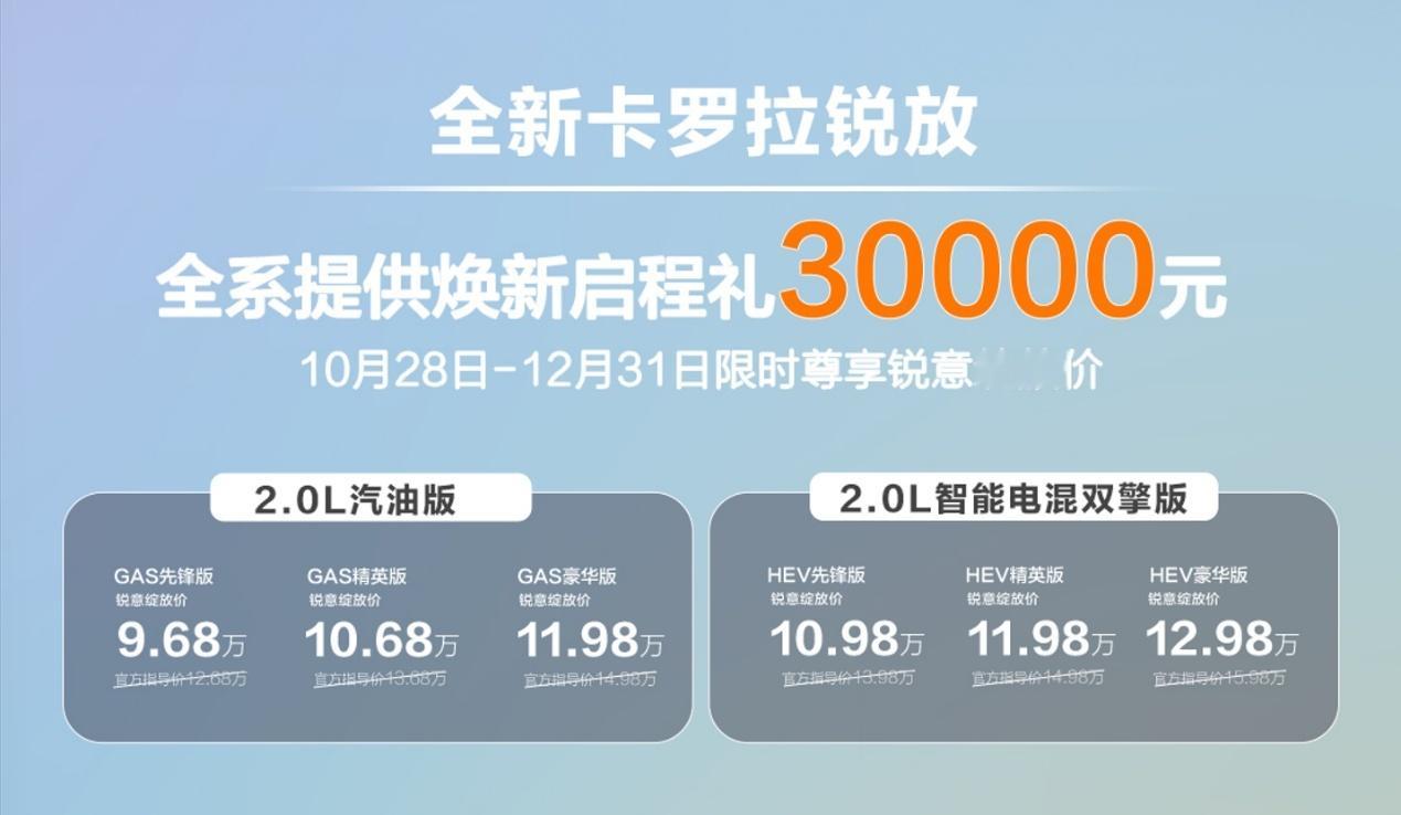 汽车资讯 10月28日,一汽丰田全新卡罗拉锐放上市,以“世界丰田,中国锐放”为核心,推出2.0L汽油版与智能电混双擎版共6款配置,官方指导价12.68万—15.98万元,限时“锐意绽放价”9.68万元起。