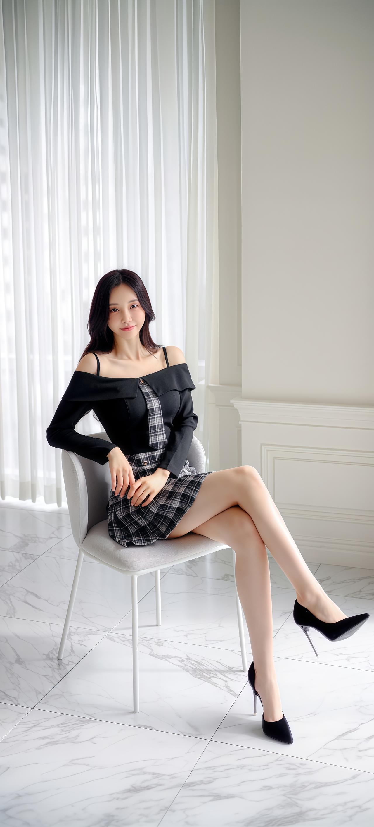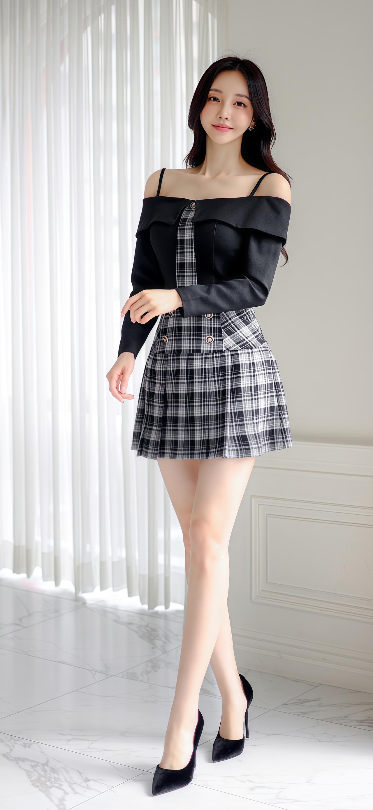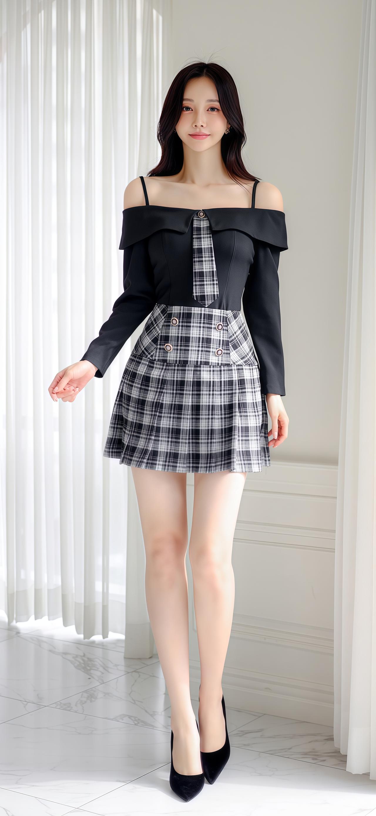 孙允珠黑色连衣裙,搭配高跟鞋。