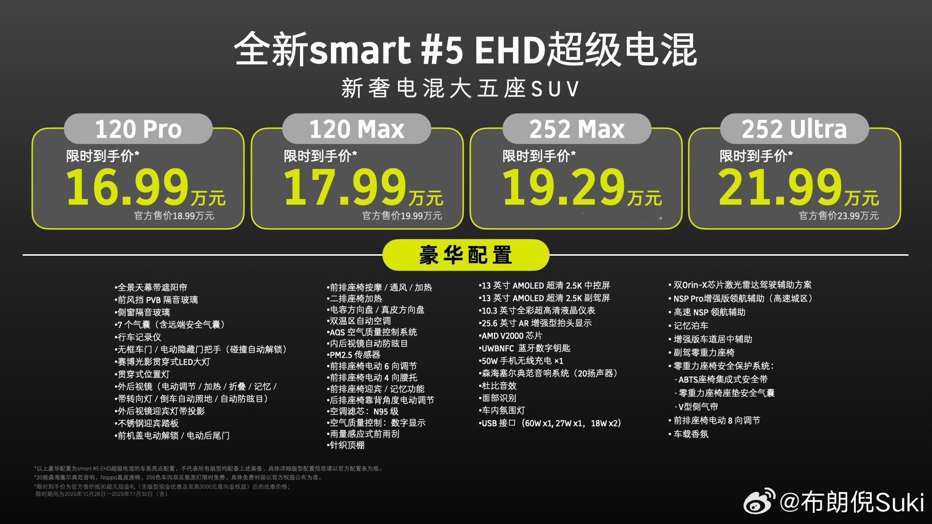 源于梅赛德斯奔驰全球设计团队打造,搭载最新一代吉利雷神电混2.0的smart 精灵5号 EHD超级电混,能轻松满足5+2+7的通勤模式。252km纯电续航里程满足5天工作日的静谧通勤,2天周末混动模式双动力备份轻松出游。7天长假CLTC综合续航1615km也能随时带你远征。1.5TD混动专用发动机实现量产第一热效率,能加92油,而且亏电油耗仅为4.4L/100km,每公里仅需3毛钱。