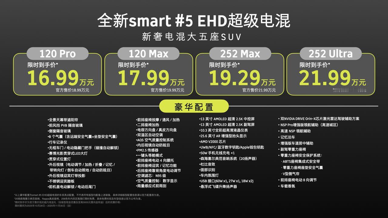 smart精灵5号EHD超级电混正式上市,限时到手价16.99万元起。 发布会现场,“smart明星密友”李乃文以首任车主的身份登台,分享日常出行痛点及选车标准。 新车共推出4个版型,全系标配120多项豪华配置。混动系统基于最新一代雷神电混2.0技术,可油可电,CLTC综合续航1615km。 搭载了沉浸式AMD 5屏智能座舱,并配备元戎智驾加持的smart Pilot Assist智能辅助驾驶系统。 新车带来5种全新外观颜色与2种全新内饰风格,整车用料极具新奢质感,配合“兼顾舒适坐姿与安全保护”的零重力座椅、20扬声器森海塞尔音响系统和奔驰同款256色氛围灯,营造堪比S级舒适豪华与沉浸式视听体验。【来自懂车帝车友圈】