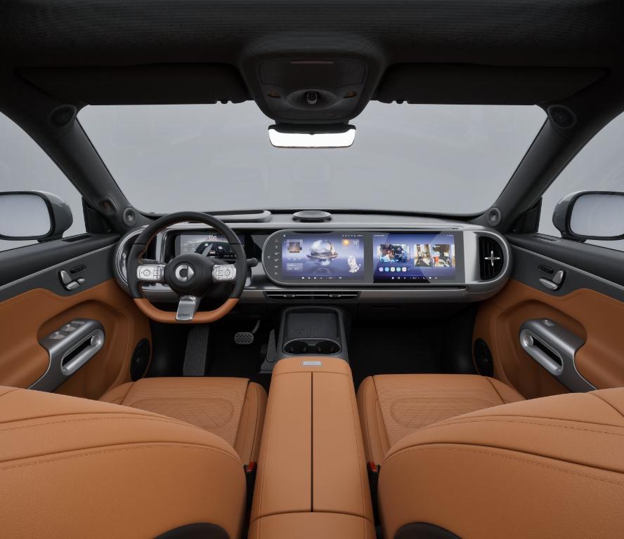 你有没有发现,现在的新能源车内饰已经千篇一律了,无非就是中间一块大屏,方向盘后一块屏,造型都大差不差,但smart绝对会有自己的特点。车内胶囊元素依旧充斥,比如最直观的10.3英寸中控+13英寸副驾屏幕,就是一个胶囊的造型,我觉得确实比方方正正的看起来更活跃;并可联动25.6英寸的AR增强型抬头显示以及藏匿与车头的233英寸的车规级全彩激光投影仪;