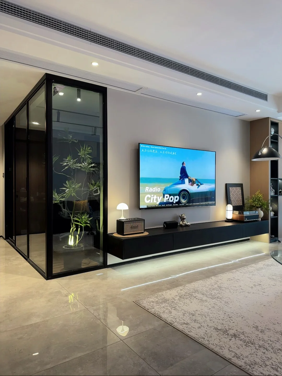 🌟电视墙的L型玻璃推拉门是客厅的点睛之笔,半透明的书房连着5平方的小阳台,空间有限,追求完美嵌入,又不想占用更多的空间,石头洗烘一体机Z1真的是聪明之选😀