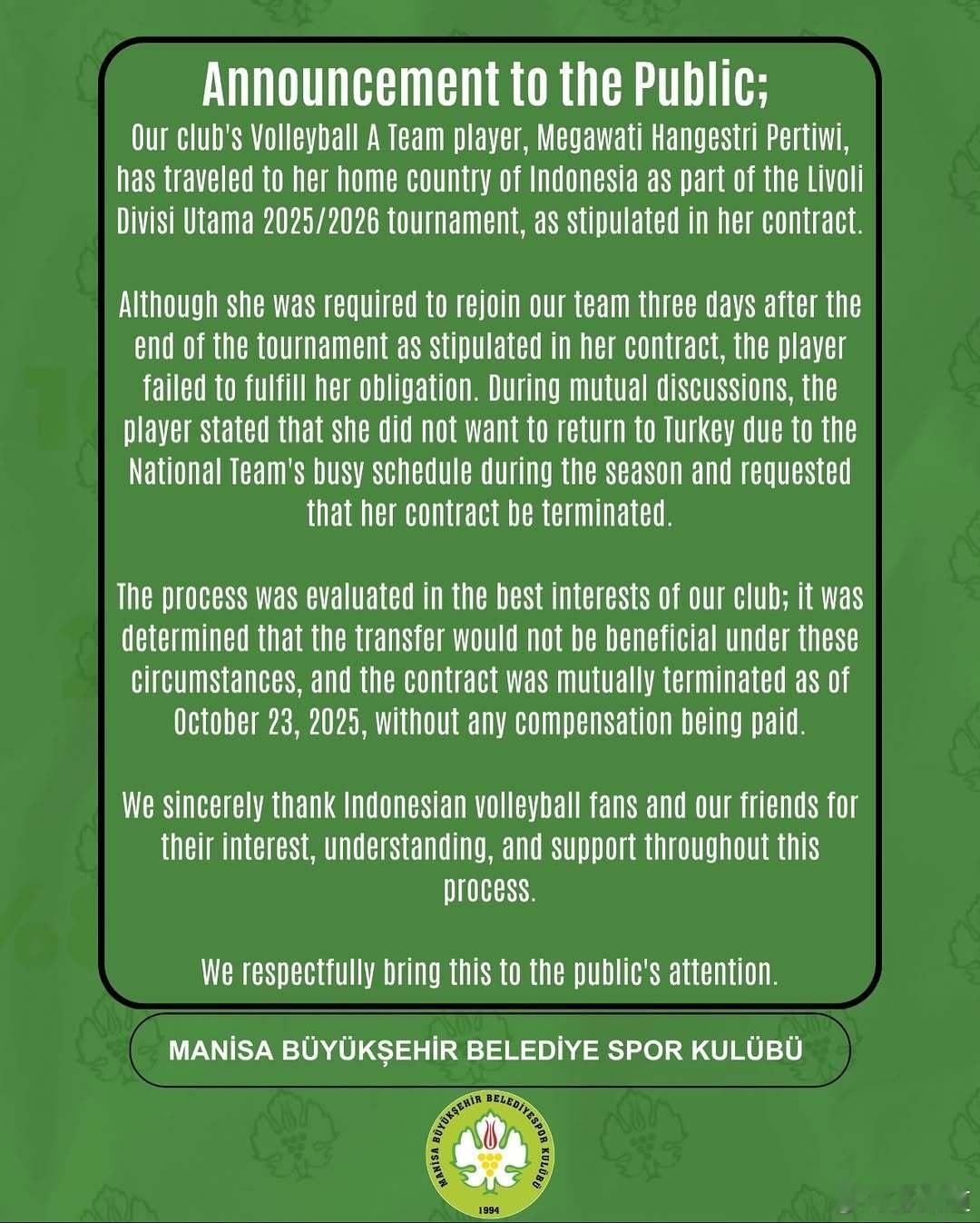 俱乐部官方声明中写道:“在相互协商期间,该队员表示她不愿返回土耳其,理由是国家队在本赛季的日程安排繁忙,并请求终止她的合同。梅加瓦蒂必须在合同中规定的比赛结束三天后重新加入我们的球队,球员 [Megawati] 未能履行她的义务。合同将于 2025 年 10 月 23 日双方终止,且不提供任何补偿。”