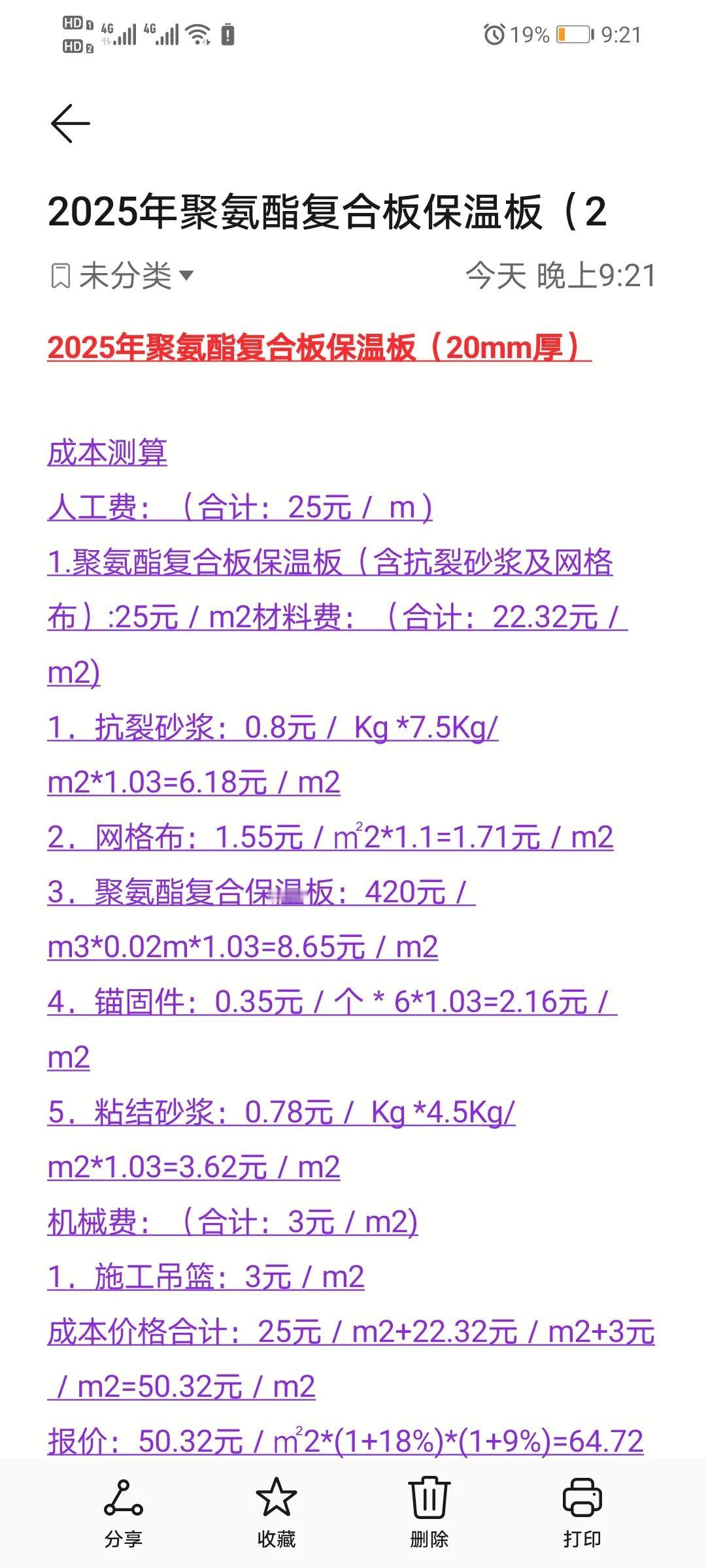 家人们,今天来给大家揭秘2025年超实用的聚氨酯复合板保温板(20mm厚)的成本到底咋算的!很多人装修或者搞工程都想知道这背后的门道,来,听我给你细细讲。 先看人工费,每平方米是25元,就光是聚氨酯复合板保温板带着抗裂砂浆和网格布的粘贴安装哦。 再说说材料费,一共是22.32元每平方米。这里面抗裂砂浆6.18元,网格布1.71元,聚氨酯复合保温板8.65元,锚固件2.16元,粘结砂浆3.62元。 还有机械费,用施工吊篮,每平方米得3元。 把这些费用都加一块儿,成本价格就是50.32元每平方米。要是再算上管理费、利润和税金这些,报价能到64.72元每平方米。 咱就说啊,这个成本算下来,其实价格还是挺合理的。但要注意,市场上可能会有一些不良商家,为了利润在材料上动手脚,用的材料质量不行或者用量不够。所以大家在选聚氨酯复合板保温板的时候,一定要睁大眼睛,别光看价格,质量才是关键,不然后期出了问题,维修起来可就麻烦大了,多花的钱可就不止一点点了,可别因小失大哦!保温板厂家报价 [比心]