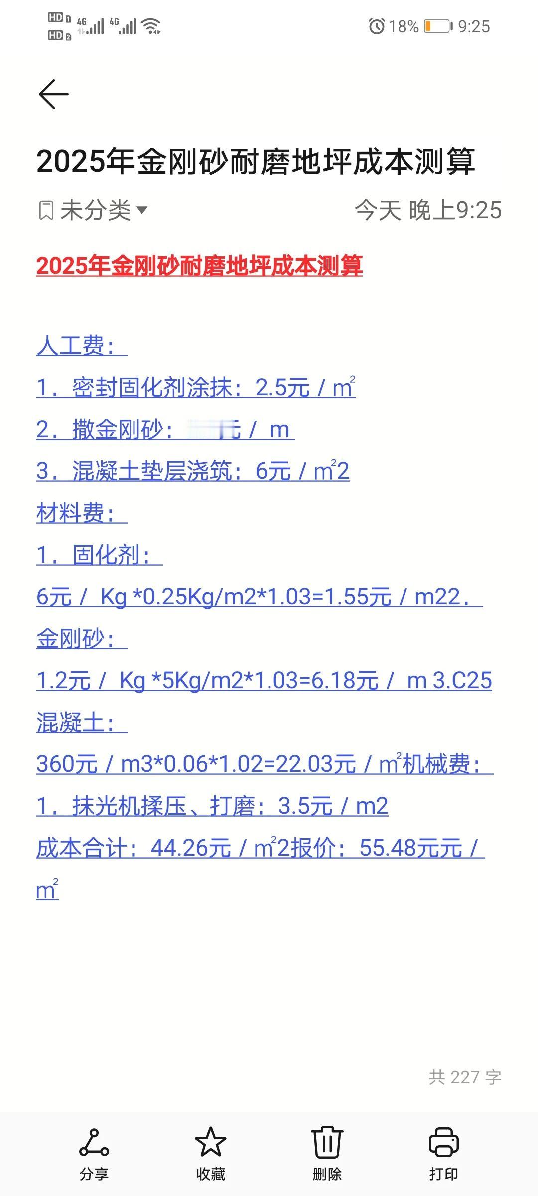 家人们,今天来给大家分享超实用的2025年金刚砂耐磨地坪成本测算,准备装修或者做工程的可千万别错过! 咱先看人工费哈,密封固化剂涂抹每平2.5元,撒金刚砂也是2.5元每平,混凝土垫层浇筑6元每平,这人工费加起来每平就11元了。 再说说材料费,固化剂每平1.55元,金刚砂6.18元每平,C25混凝土要22.03元每平。还有机械费,抹光机揉压、打磨每平3.5元。把这些费用全加一块儿,成本合计每平44.26元,报价是55.48元每平。 我得跟大家说,金刚砂耐磨地坪现在应用可太广泛了,但这里面门道也不少。很多人以为价格低就划算,其实不然。有的施工方可能会在材料上偷工减料,比如用质量差的金刚砂或者固化剂,当时看着成本是低了,可后期很容易出问题,像地面不耐磨、起砂之类的,到时候维修成本可就高了去了。所以啊,咱们不能只看价格,一定要综合考虑材料质量、施工工艺这些因素,毕竟一分钱一分货,只有把钱花在刀刃上,才能做出既耐用又实惠的金刚砂耐磨地坪,大家说对吧?