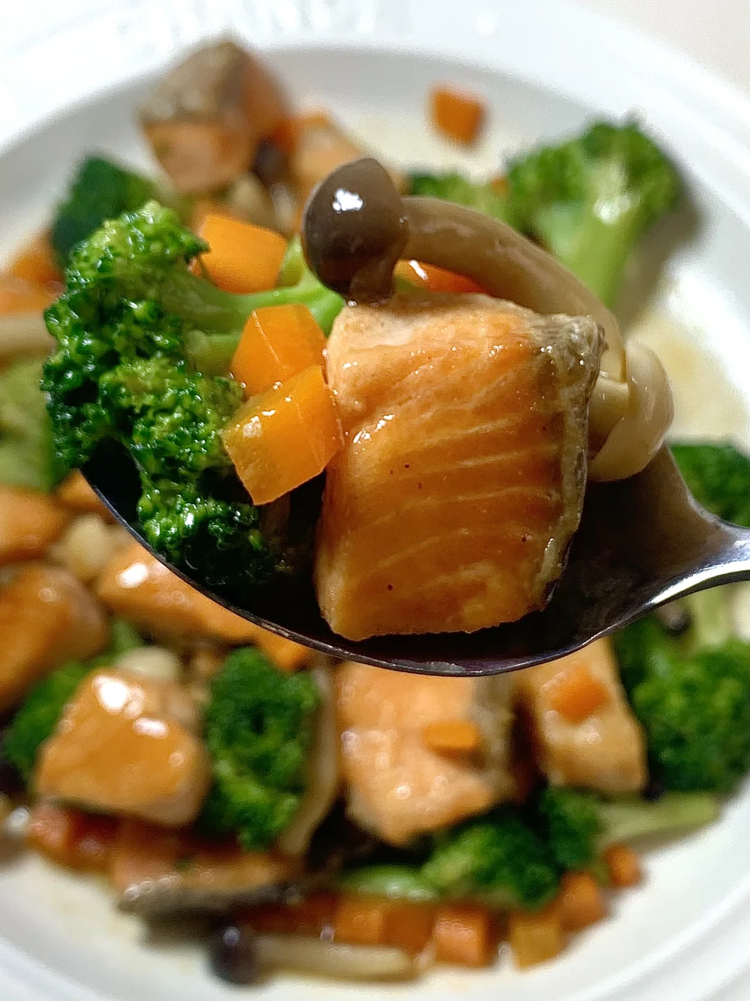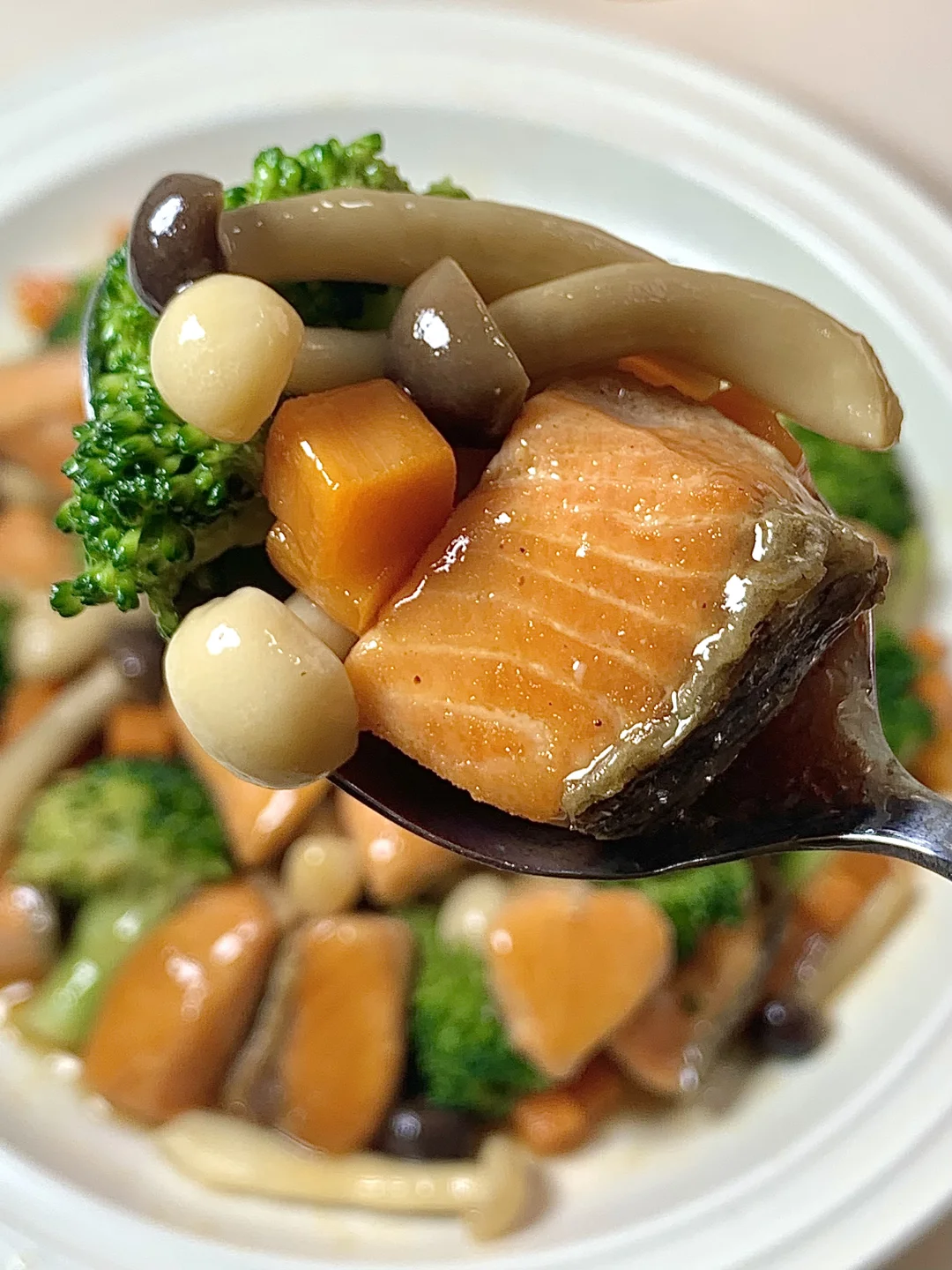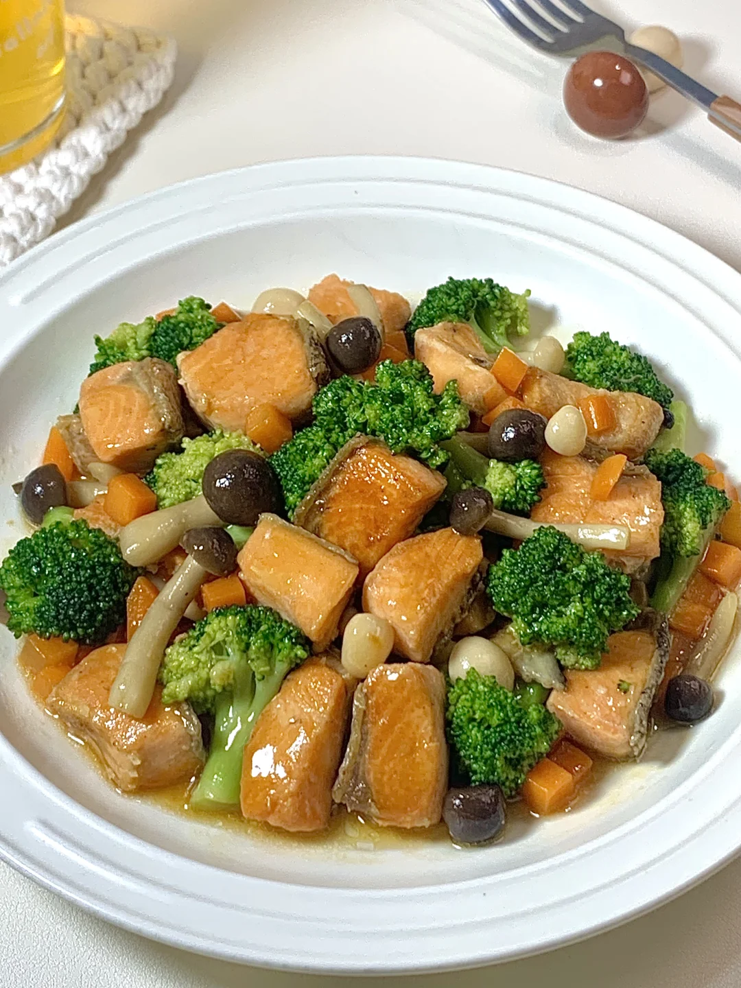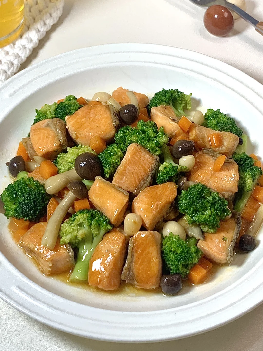 今天晩餐吃的减脂餐(三文鱼炒鲜菇西兰花)嘎嘎鲜美😋 🥦食材:西兰花、三文鱼、鲜菇、胡萝丁 🫕做法: 1️⃣水开放 西兰花 鲜菇焯水1分钟捞出备用 2️⃣锅里喷油放入三文鱼煎熟→倒入焯水的西兰花鲜菇→炒匀+适量水 3️⃣加入1勺蚝油+1勺生抽+适量鸡精胡椒粉炒匀即可出锅啦~ 🍃装盘开吃啦~ 简单易做~姐妹们快做起来吧[派对R]