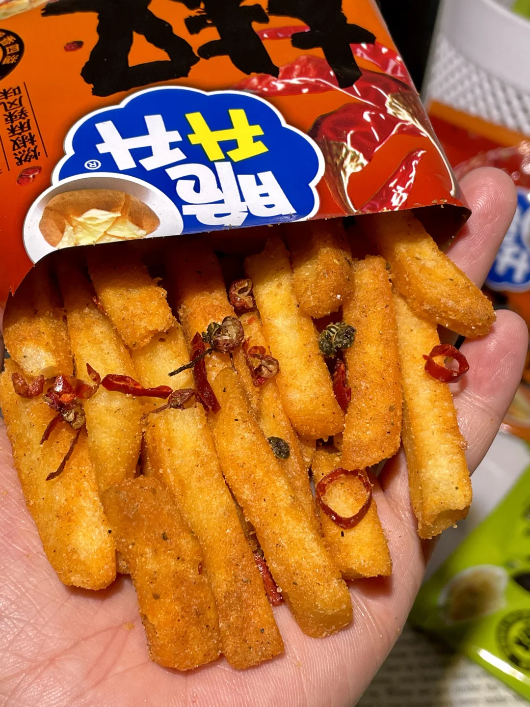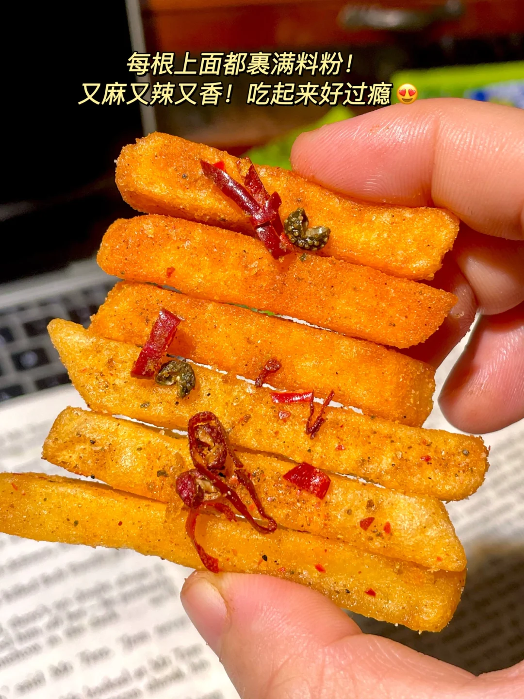 打开就能闻到辣椒的香味,里面好多干辣椒圈和花椒,每一根上面都是满满的料粉!又香又辣吃完一根又一根!完全停不下来!
