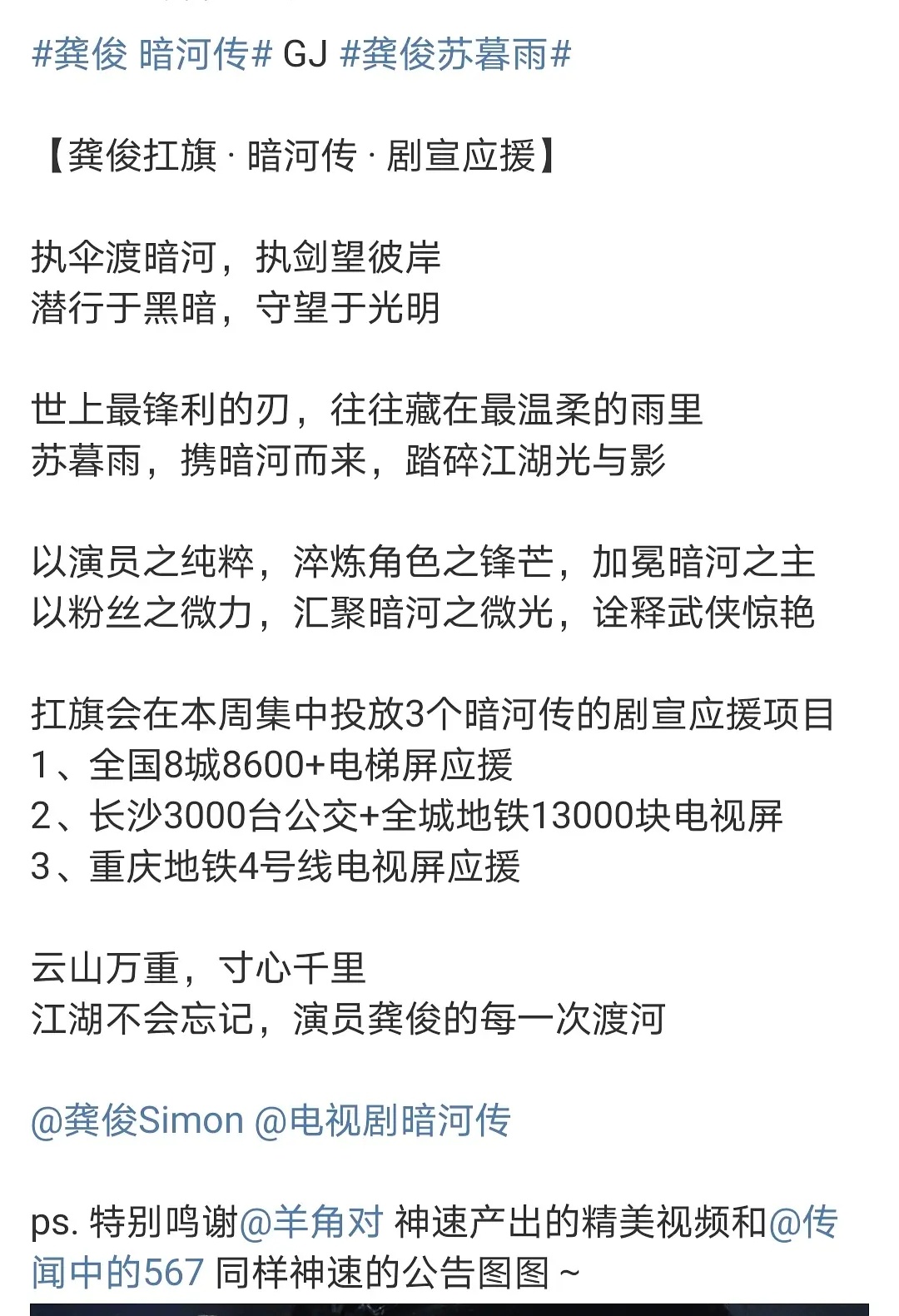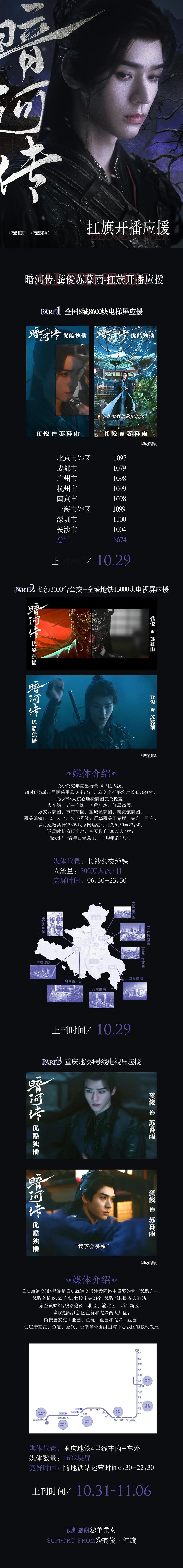 龚俊粉丝大屏应援暗河传:全国8城8600+电梯屏,长沙3000台公交+地铁13000块电视屏,重庆地铁4号线电视屏7天,太牛了[爱慕]