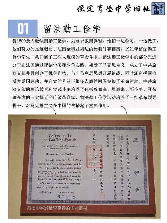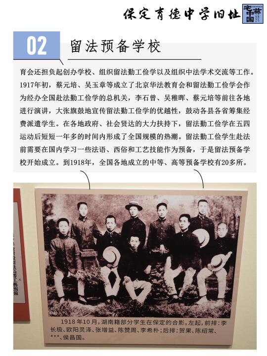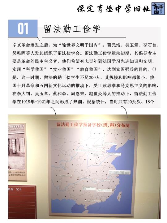 留法勤工俭学运动最早起源于旅法的华工教育,辛亥革命之后,为“输世界文明于国内”,留法勤工俭学开始兴起,五四运动后受工读思潮和马克思主义的影响,留法勤工俭学运动成为热潮。学生赴法前需在国内学习法语、西俗和工艺技能作为预备,保定育德中学教学质量之高、教学设备之良、赴法人数之多是其他预备学校无法之比拟。