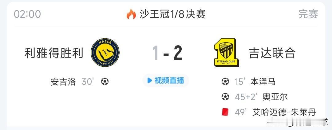 本泽马再次战胜C罗。 作为皇马的老队友,来到沙特的团队成绩,本泽马遥遥领先于C罗的。 本赛季志得意满的利雅得胜利在联赛里2:0战胜吉达联合。来到沙王冠赛场,尽管吉达联合仍然压力很大,在早早少一人作战的情况下,顽强的战胜了利雅得胜利。 本场比赛本泽马率先进球,C罗也贡献一次助攻。 不过,胜利还是属于本泽马,率队晋级。