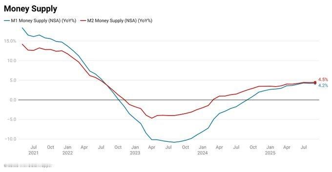 美国经济数据美股美股[超话] 美国金融体系中的货币总量持续上升,最新数据显示,增速为自2022年夏季以来最快。