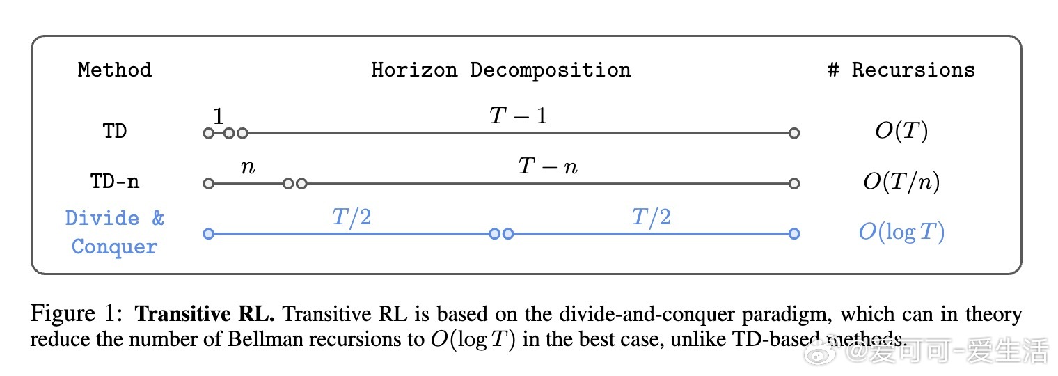 在强化学习中,长时间跨度任务面临“地平线诅咒”:传统时序差分(TD)方法的偏差随时间累积,蒙特卡洛(MC)方法则受高方差困扰。最新预印本《Transitive RL: Value Learning via Divide and Conquer》(arxiv.org/abs/2510.22512)提出了一种创新算法——转移强化学习(Transitive RL,TRL),基于分而治之思想,利用目标条件强化学习(GCRL)中固有的三角不等式结构,实现价值函数的高效更新。
