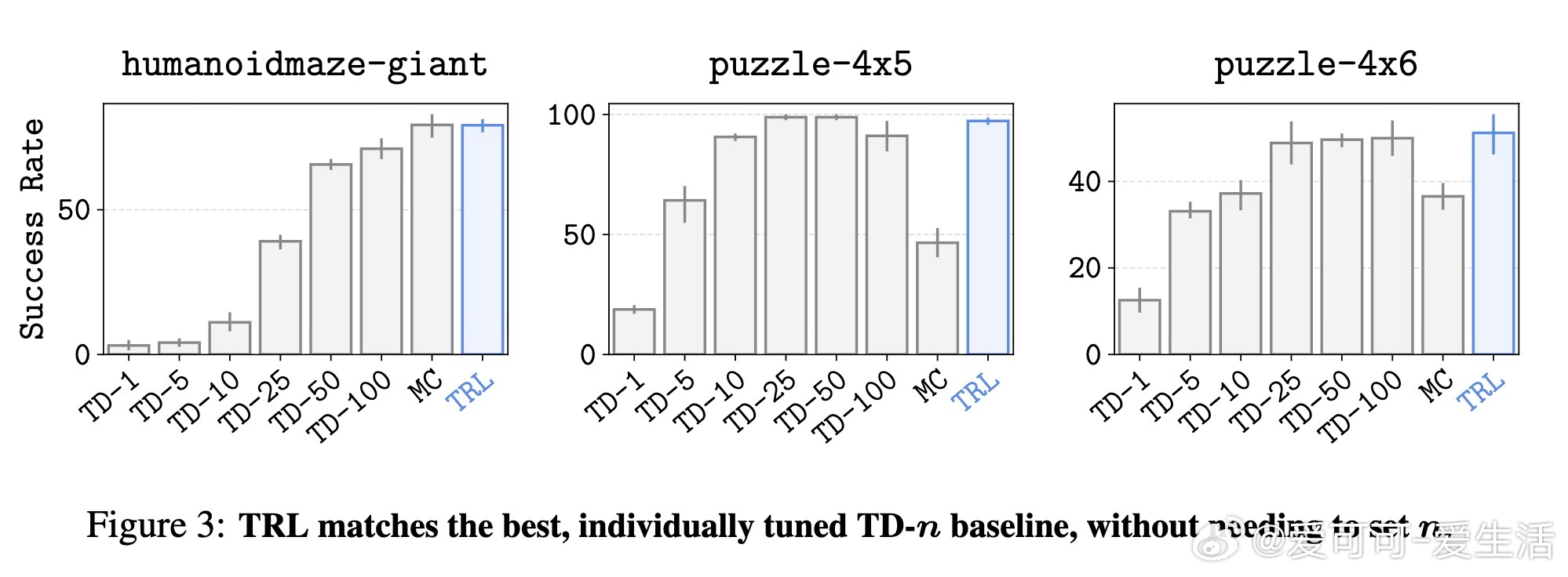 实验结果表明,TRL在Humanoid Maze大型迷宫、Puzzle按钮拼图等复杂长时间跨度任务中,优于或匹配了当前主流的TD-n步和MC方法,同时在标准OGBench基准测试中也展现出强劲表现,尤其在无需精细调节超参数n的情况下取得最佳成绩,显著提升了离线目标条件强化学习的可扩展性。